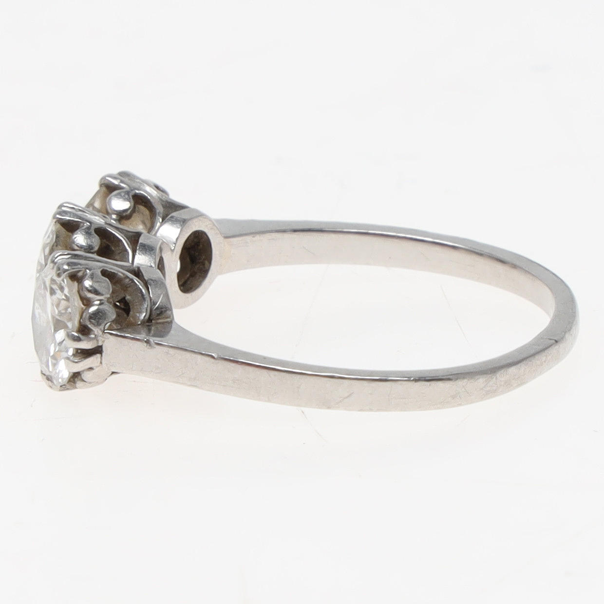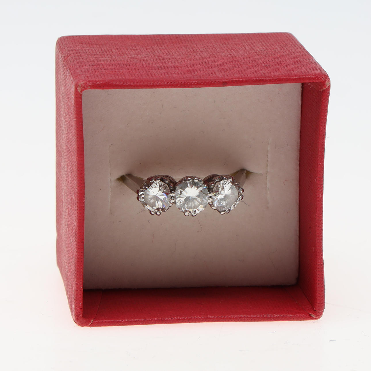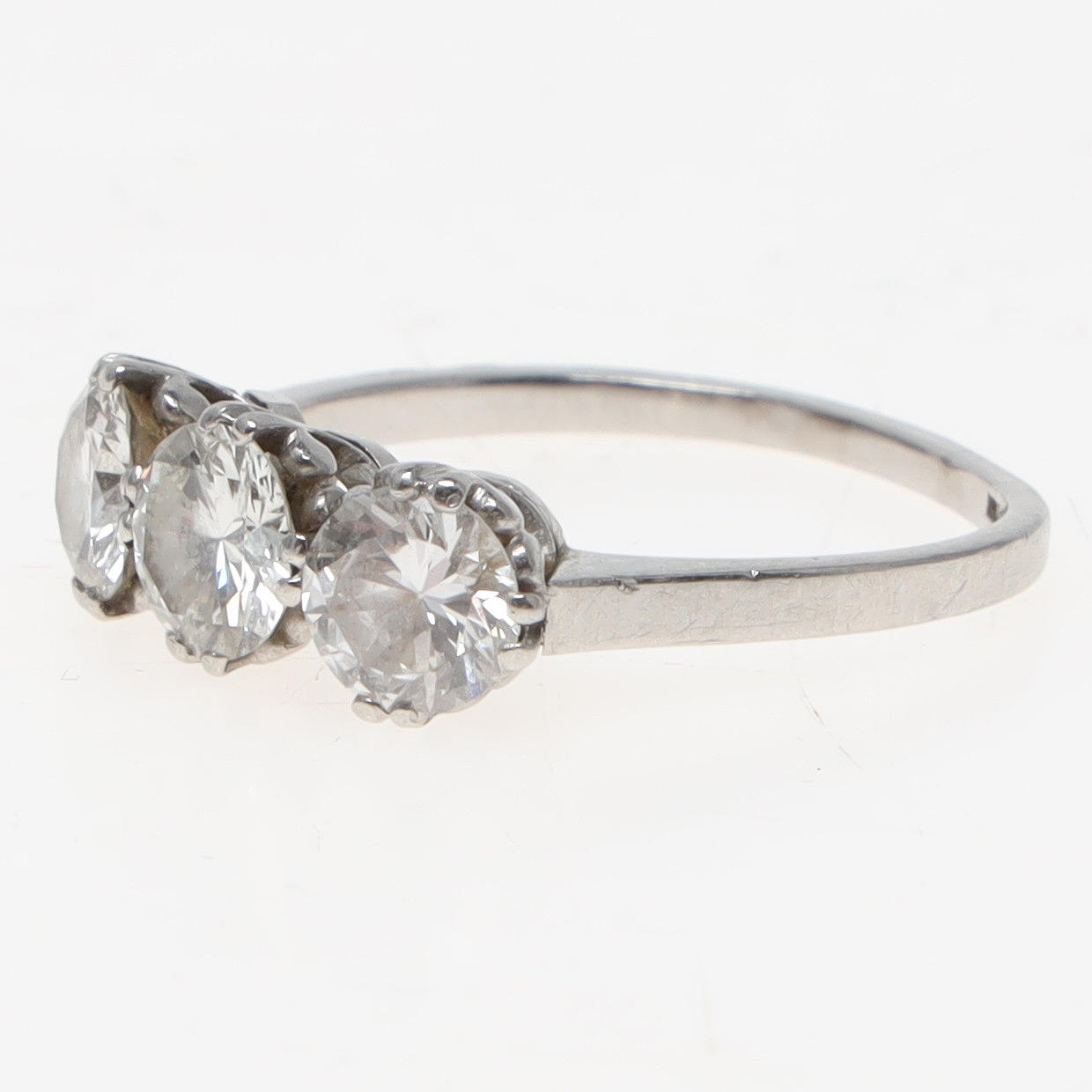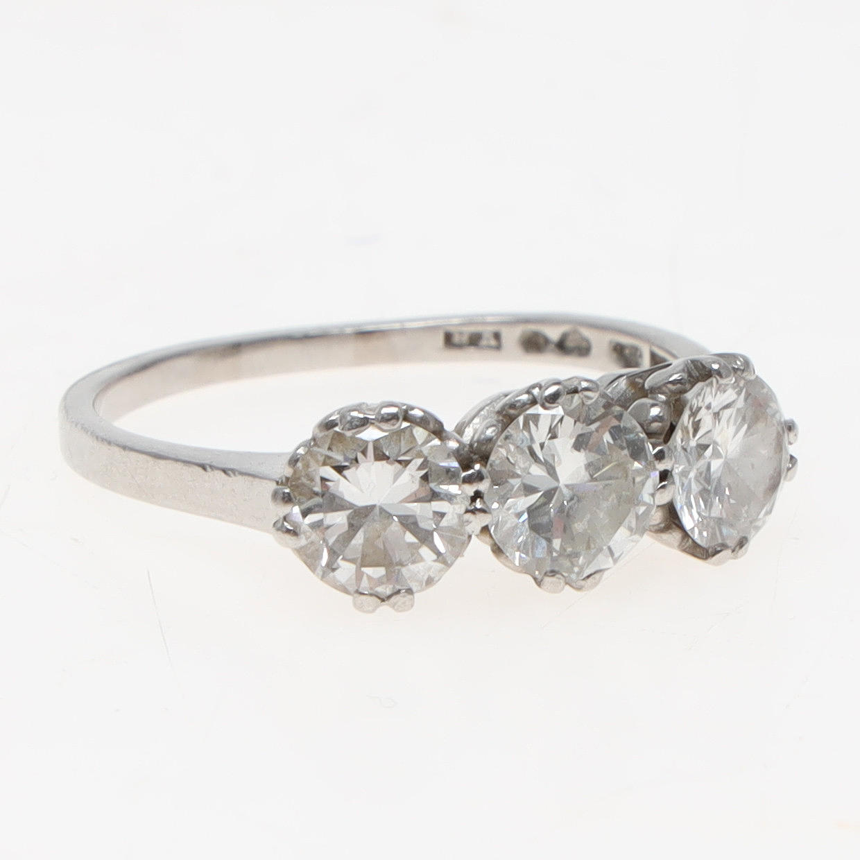Kolme sarjaa timantteja yhteensä 1,83 ct. W/Si. Sormuksen koko noin 56 (17,75 mm). Leimattu Wallin & Thorsen, Borås 1947. Paino noin 4,2 grammaa.