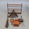 Kulmahyllyn korkeus n. 52 cm sivut n. 38 cm Puulaatikon korkeus n. 22 cm leveys n. 23 cm Leipälapio pituus n. 42 cm leveys n. 20 cm "liitospuukappale" pituus n. 100 cm Lautastelineen korkeus n. 66 cm leveys n. 80 cm syvyys n. 12cm Käsikylvökone.