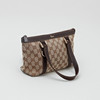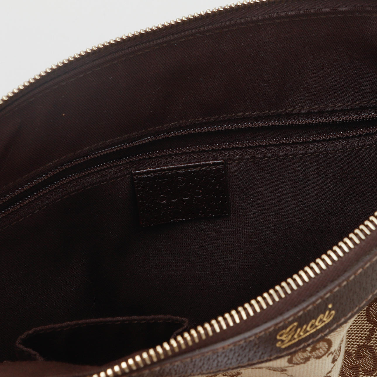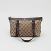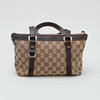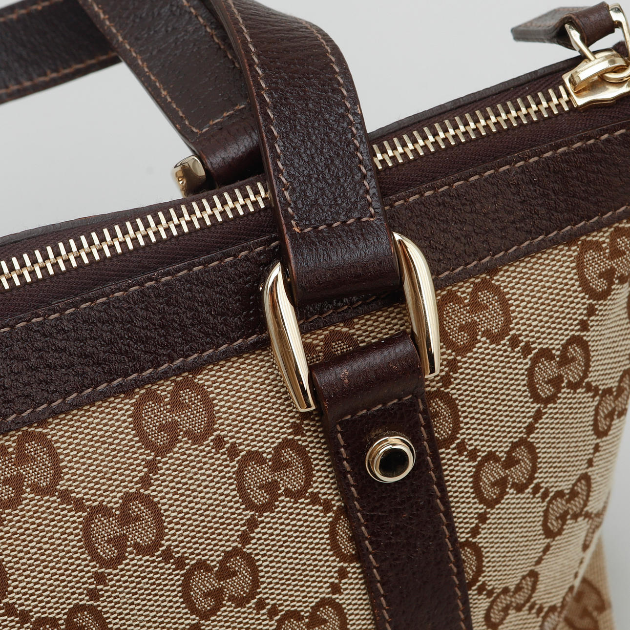 Monogrammikuvioinen laukku, jossa yksityiskohdat tummanruskeaa nahkaa ja keltaista metallia. Kaksi sisätaskua, joista toisessa vetoketju. 29 x 17 x 9 cm.