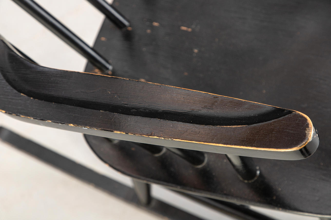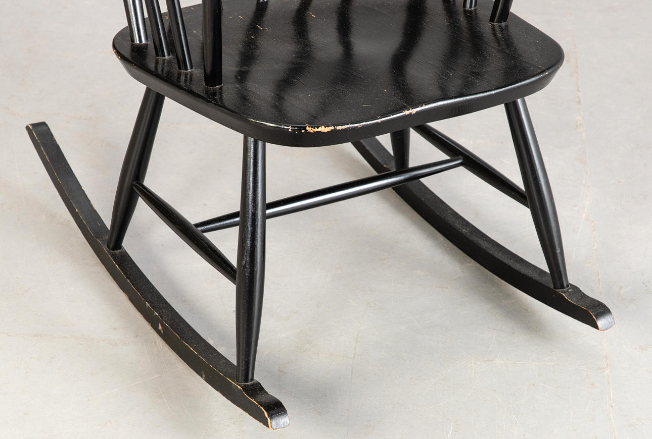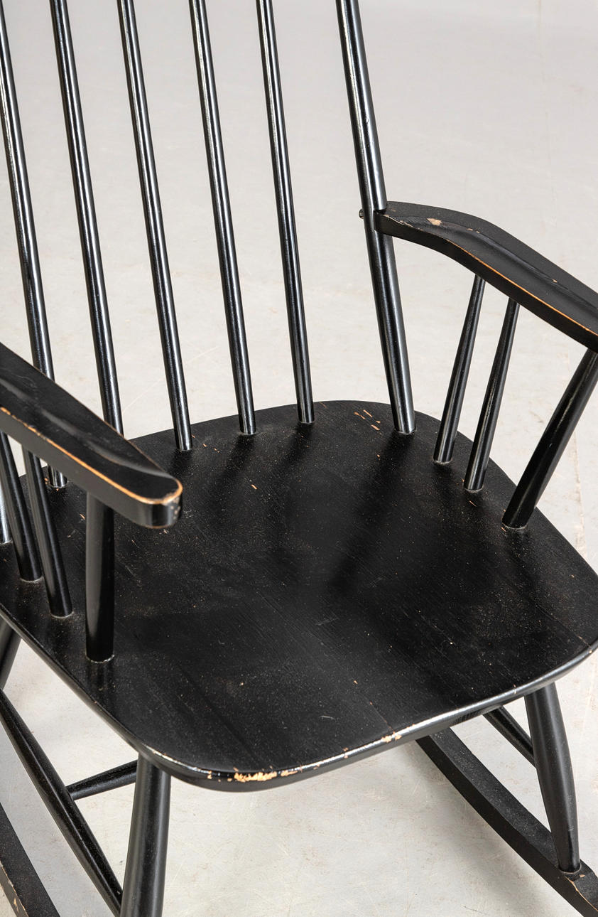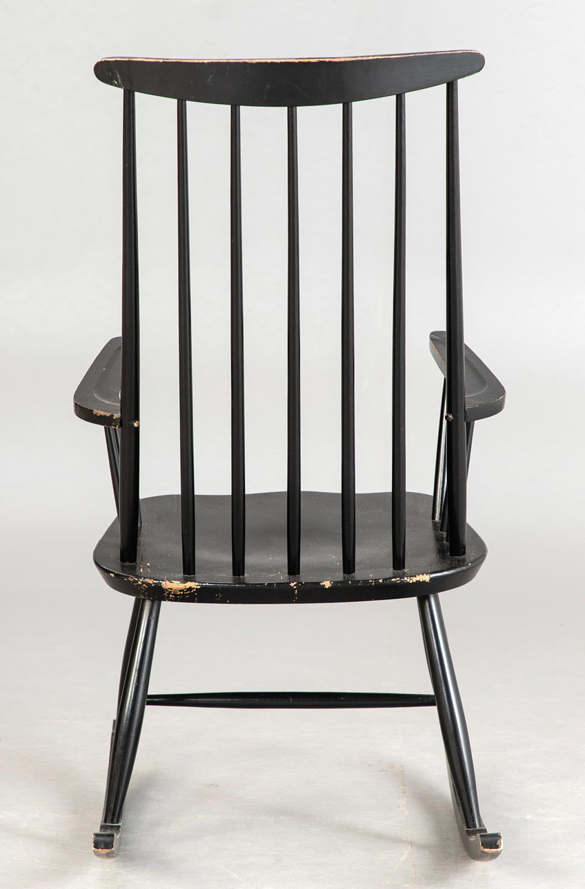Ilmari Tapiovaaran keinutuoli Askolle. Suomi, 1950-luku. Runko säleisellä selkänojalla puuta, maalattu mustaksi.