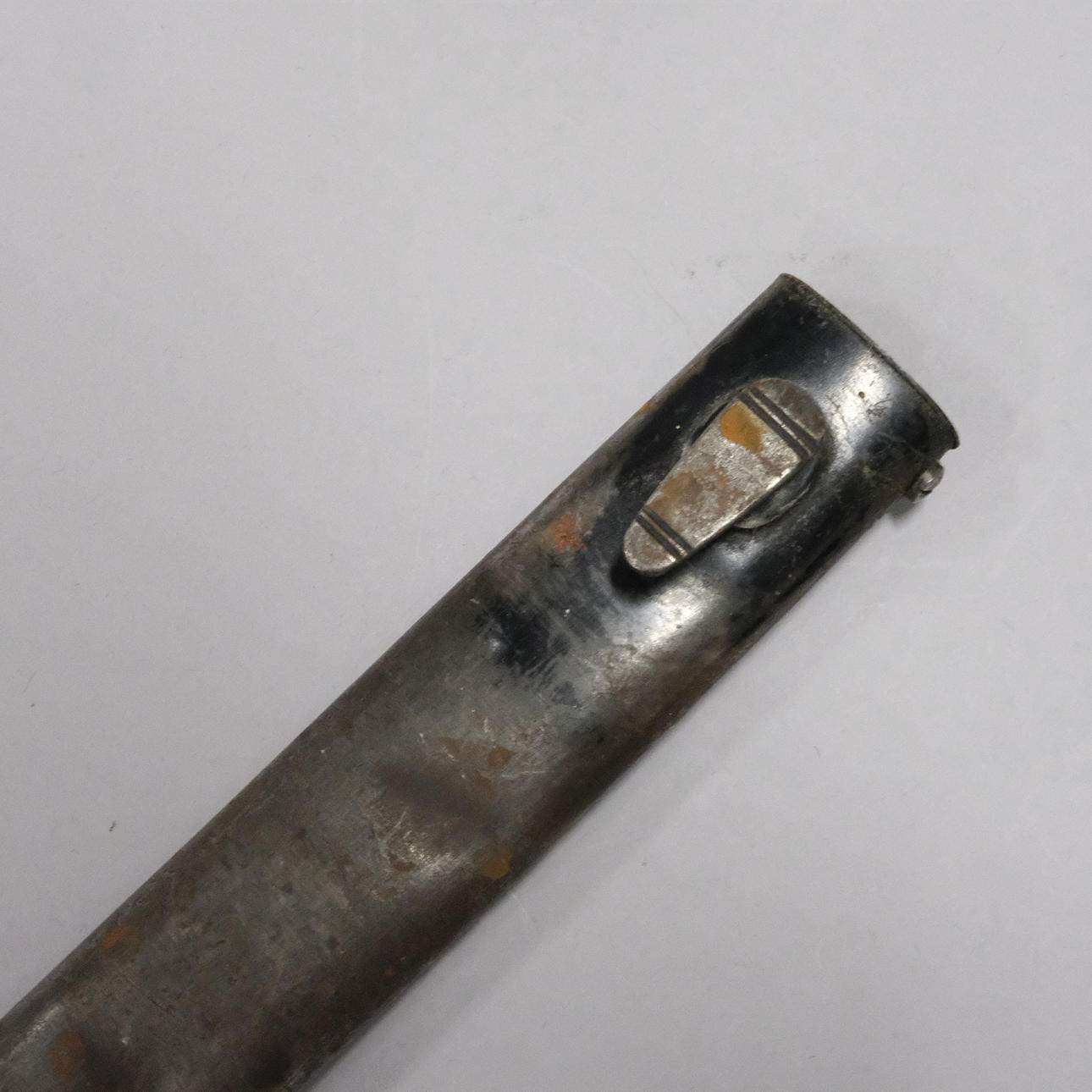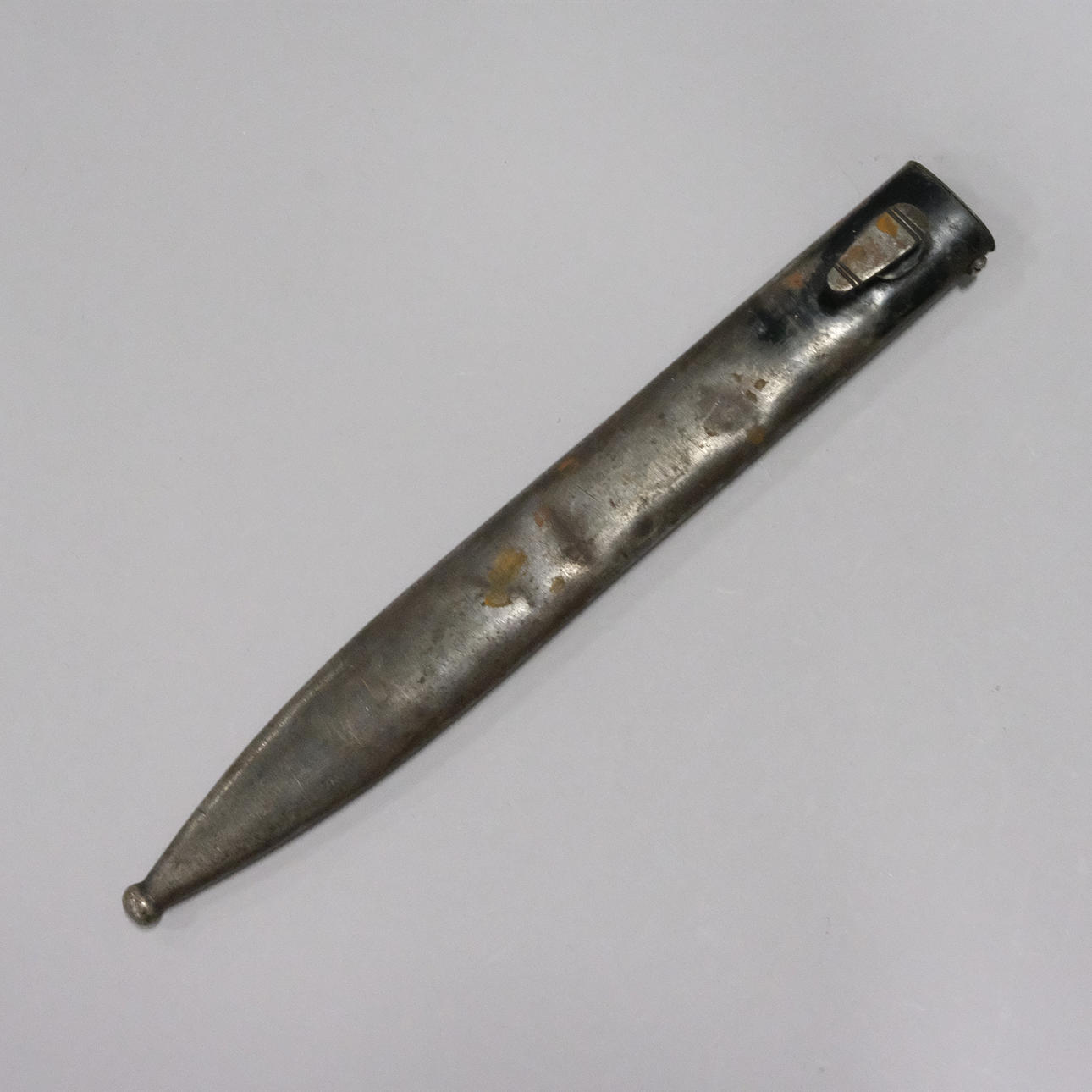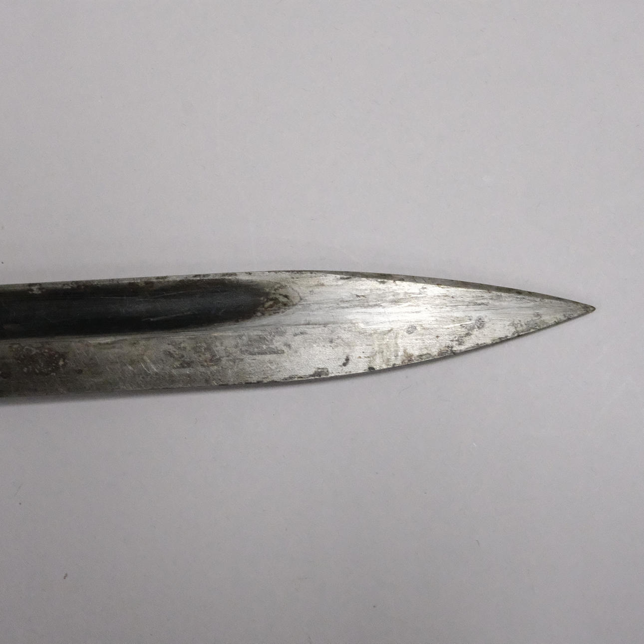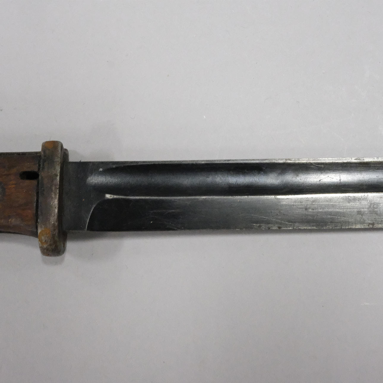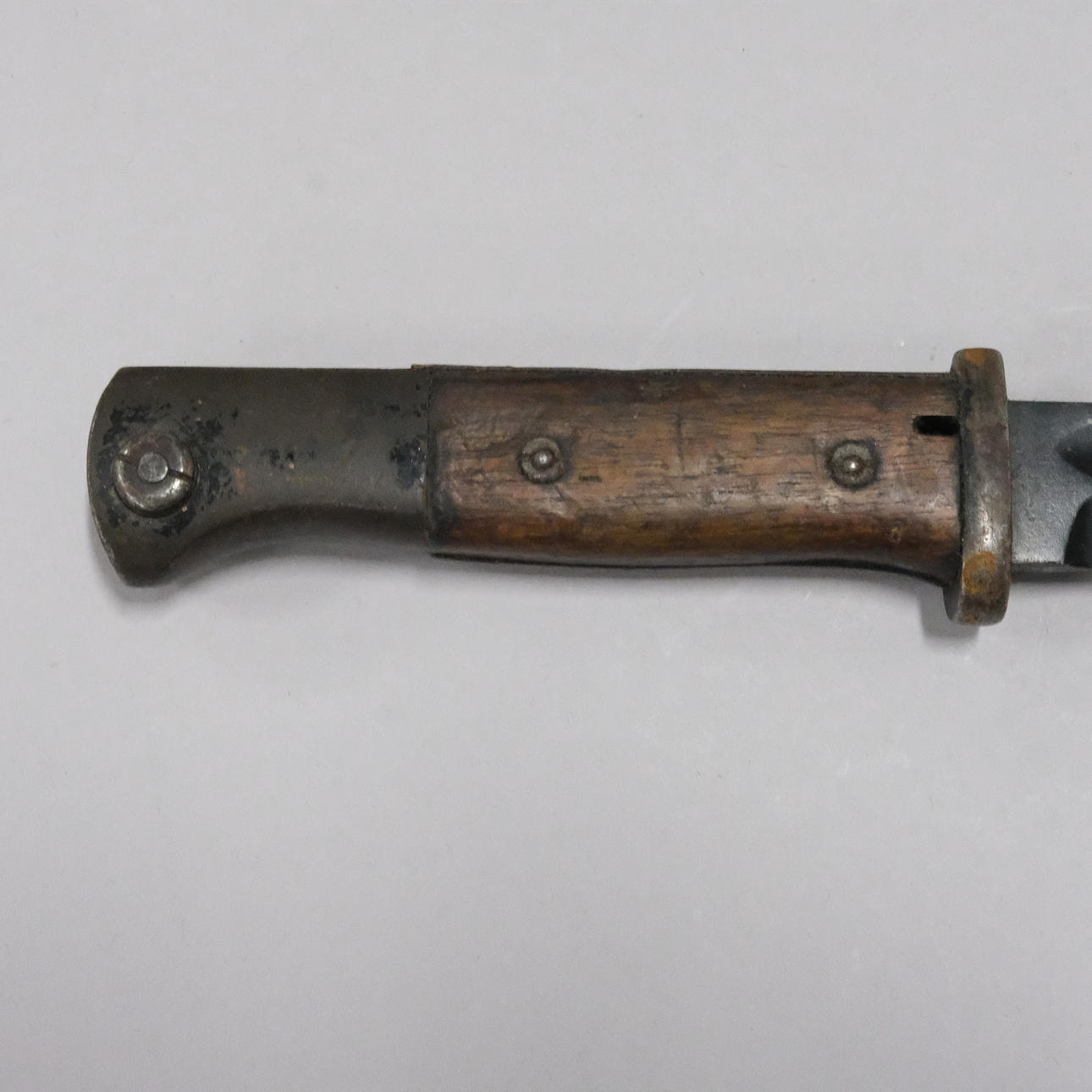 Mauser pistin. Terä sinistettyä terästä. Pituus: noin 252 mm. Kahva puuta ja metallia. Kokonaispituus (sis. amme): noin 405 mm.