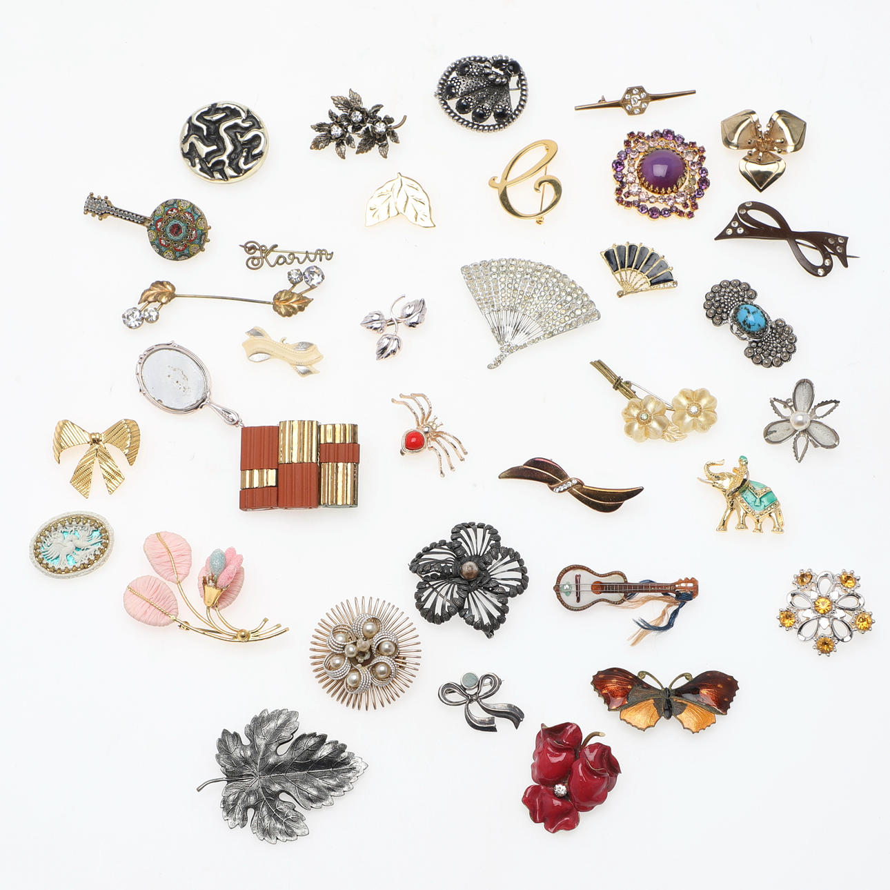 Rintaneula, hopea ja malakiitti, n. 28x27 mm. Rintakoru, metallia.