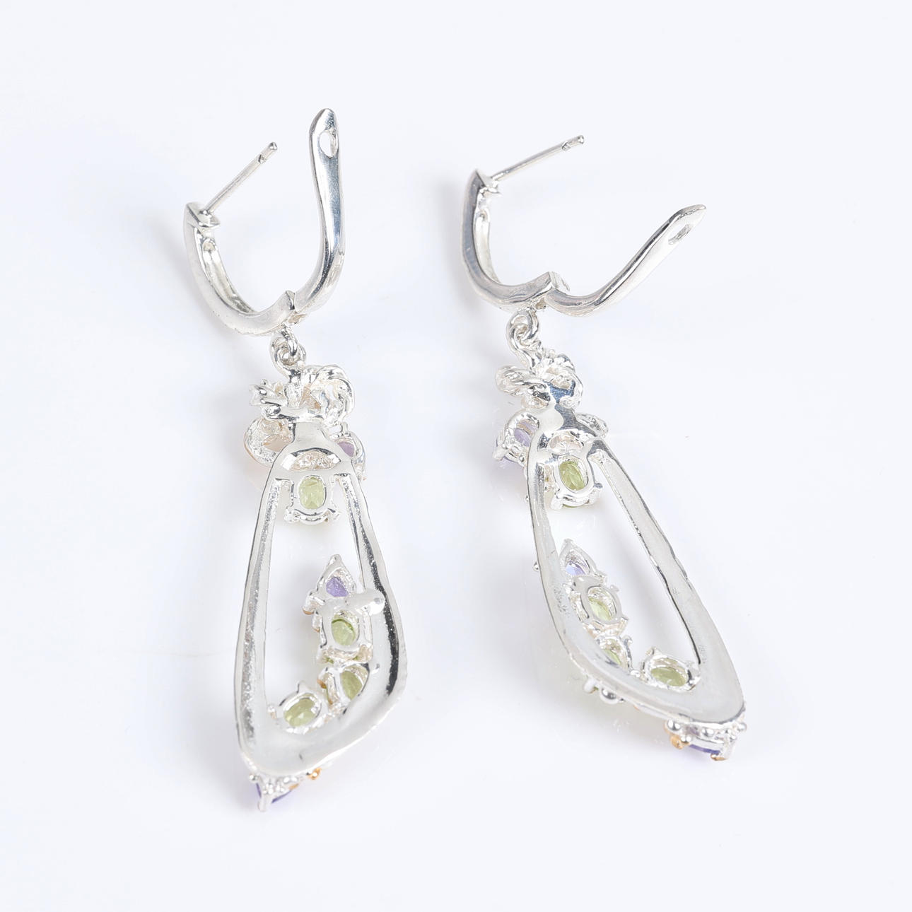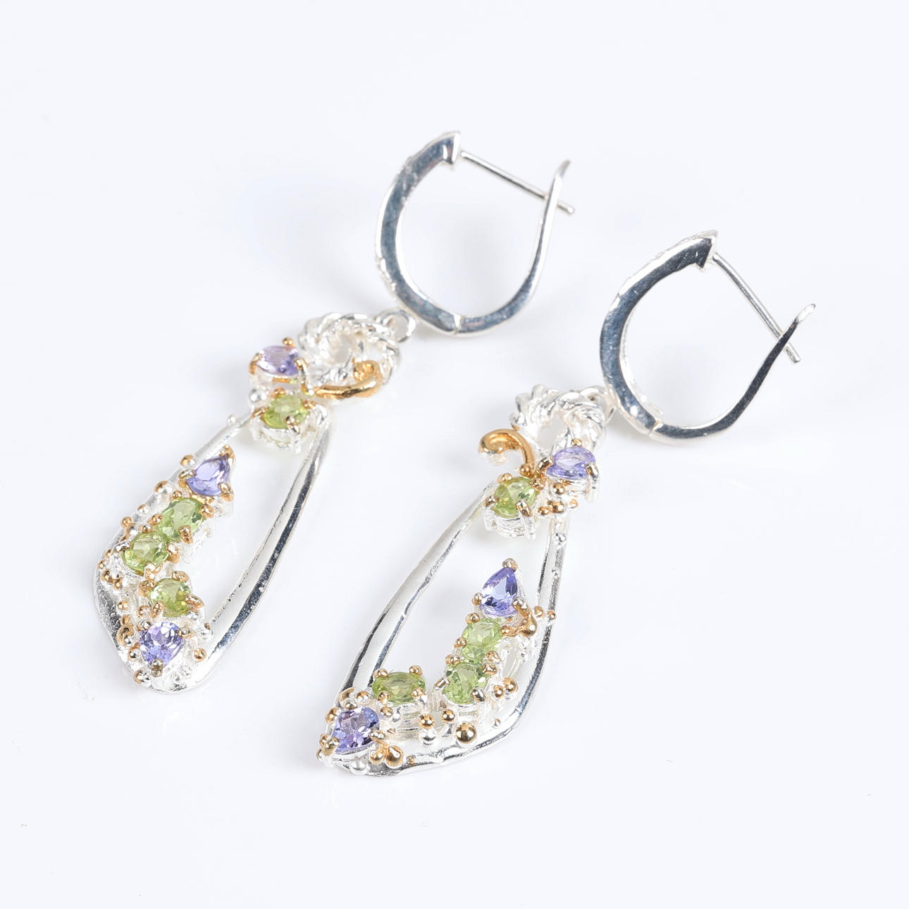 Korvakorupari sterlinghopeaa, kullattu koristelu ja 3 päärynäleikattua peridottia ja 4 soikeaa tansaniittia per korvakoru Korkeus 6 cm Leimattu 925.