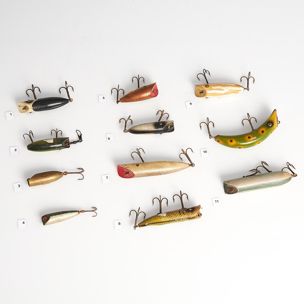 1. Bass-O Bite (SB) 2. Midget Oreno (SB) 3. Basso-Oreno Midget (SB) 4. Basso-Oreno, kääpiö (SB) 5. Puolikokoinen Bass-Oreno-kopio 6. Basso Oreno (SB) 7. Amerikkalainen kopio SB:n Bass-Orenosta, korkealaatuinen 8. Bass-Obite (SB 1937) 9. Bass-Oreno Glass Eye (SB 1923) 10. Teas Oreno (SB) 11. Kopio SB:n Bass-Oreno SB:stä - South Bend, USA.