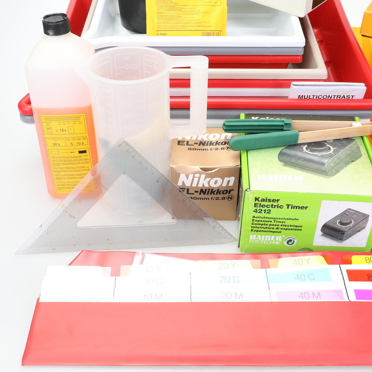 Muun muassa kehityskulhot, kehityslaatikko, pimiölamppu jne.