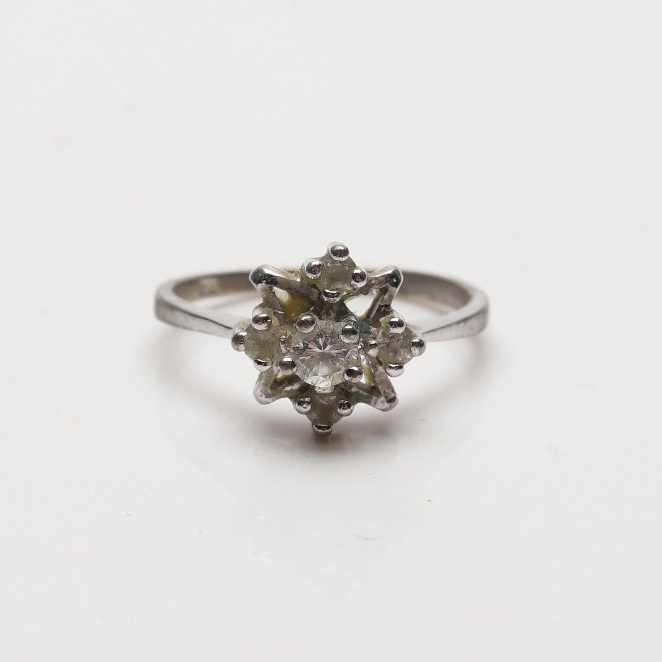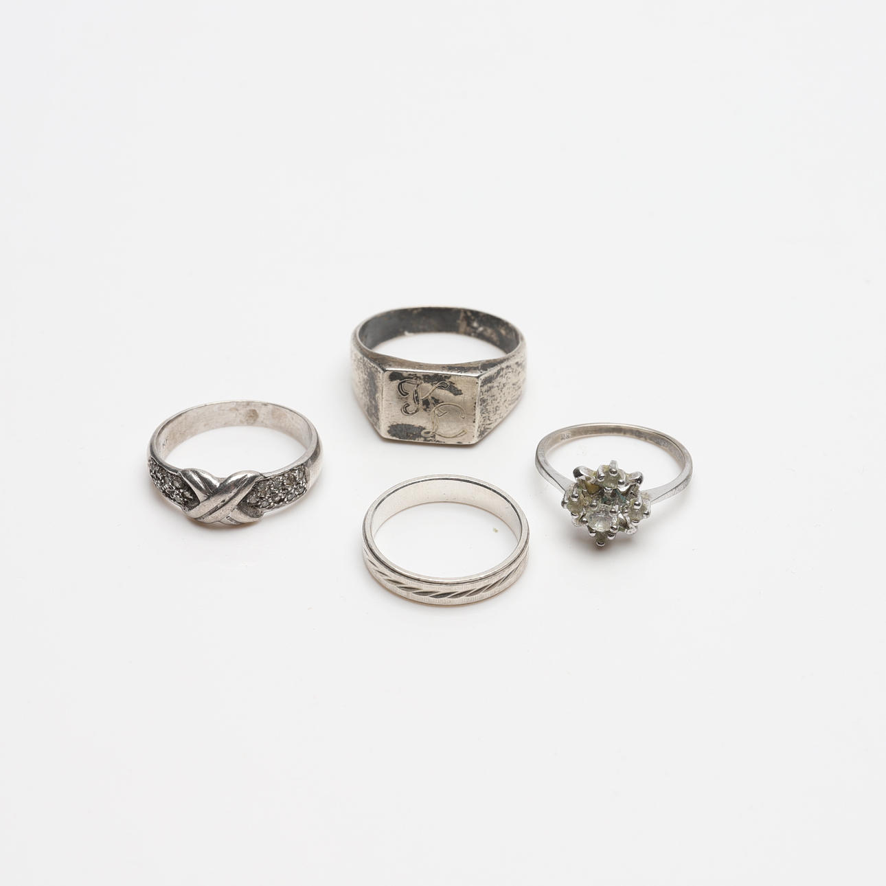 Sormukset, 4 kpl, hopea, sis. valkoisilla kivillä. Renkaan koko noin 17,25-20,5 mm.