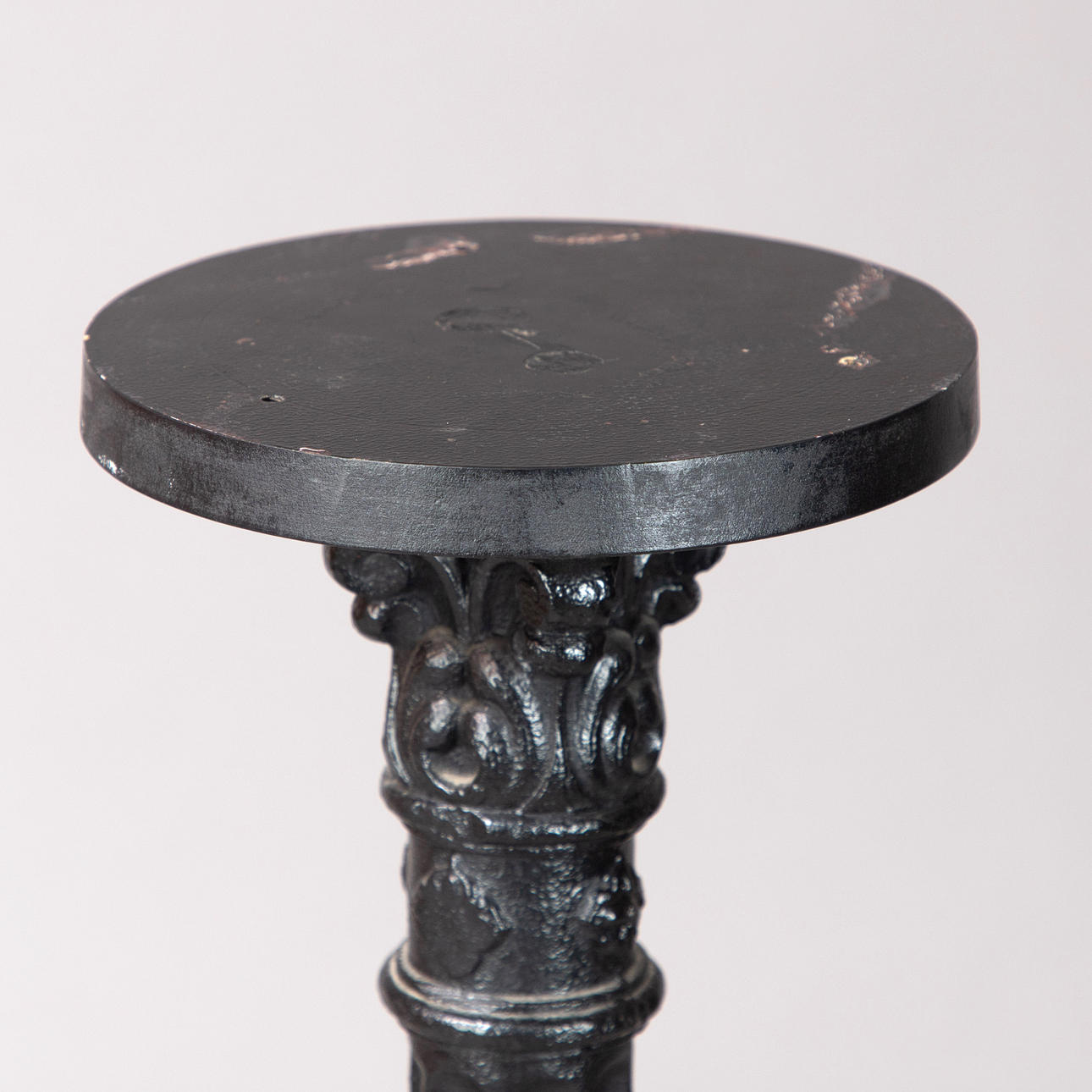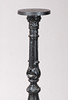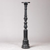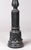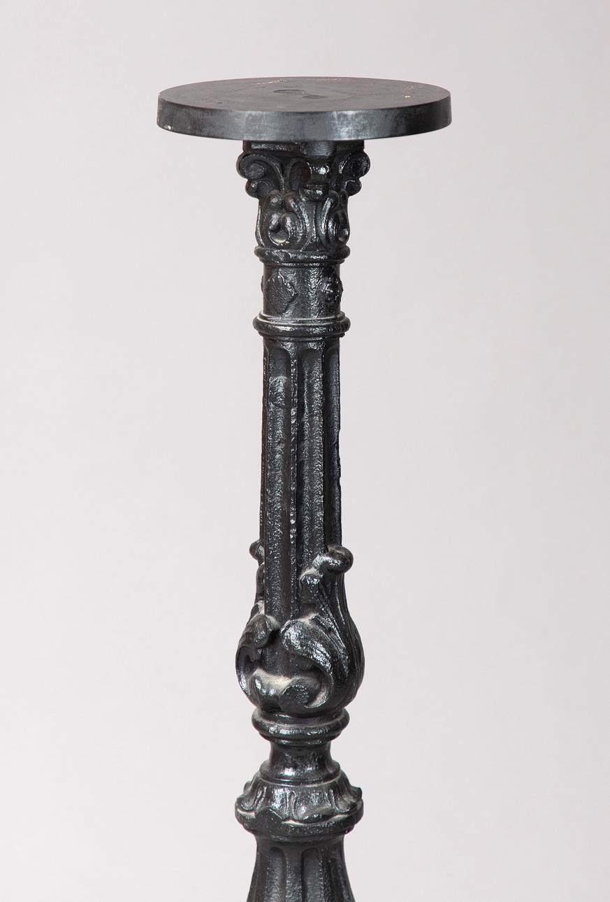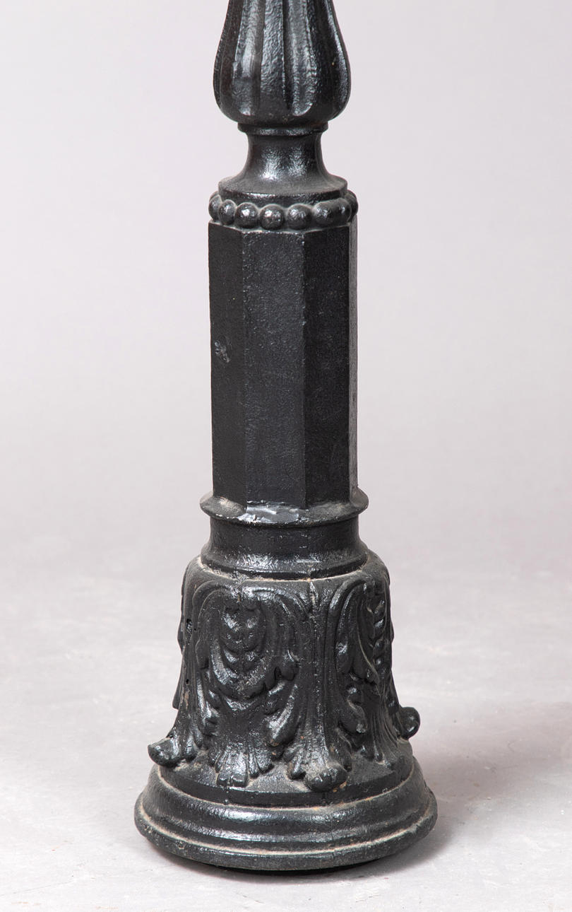 Valurauta, mustattu. Pyöreä pohja, jossa monipuolinen helmirengas. Nivelakseli, uritettu. Lehtikiinnikkeet ja kohokuvioiset koristeet. H: n. 106 cm.