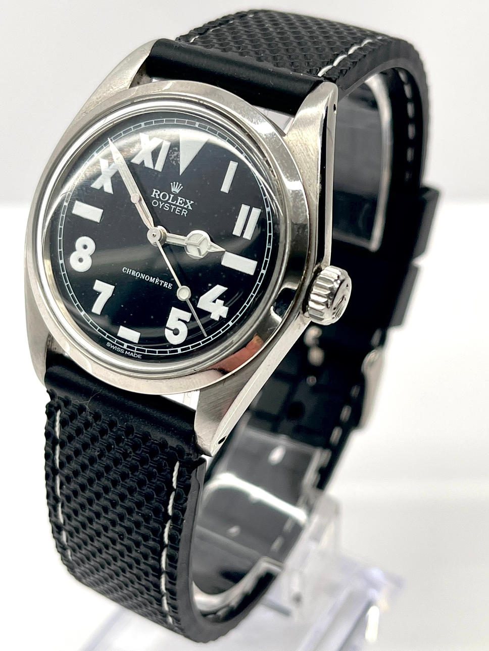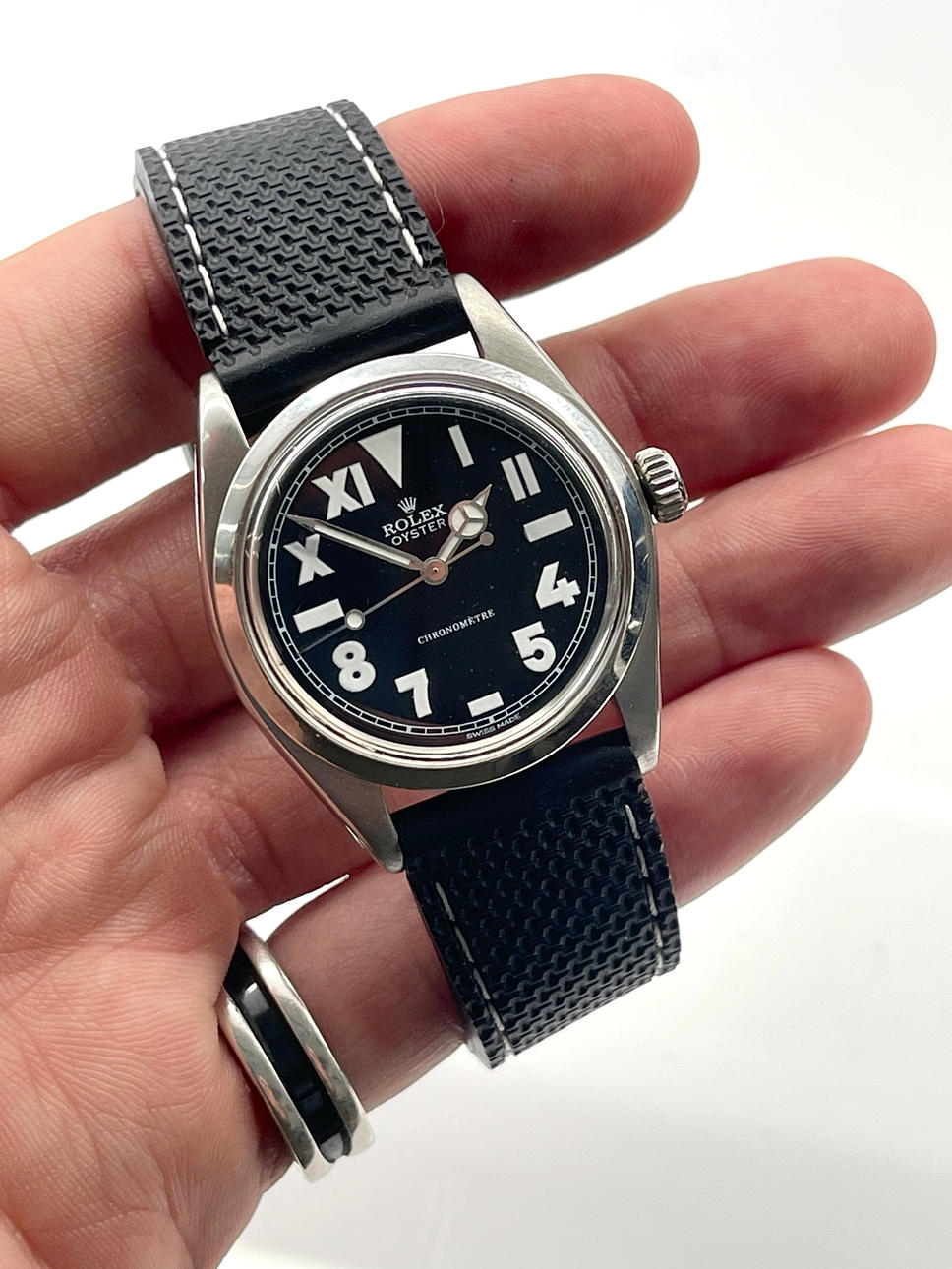Teräskotelo, halkaisija 34 mm. Kumihihna ja solki, molemmat eivät alkuperäisiä. Ruuvattava kruunu. Manuaalinen kelausliike. 70-luku.