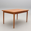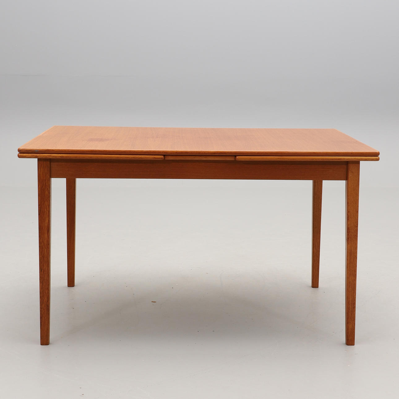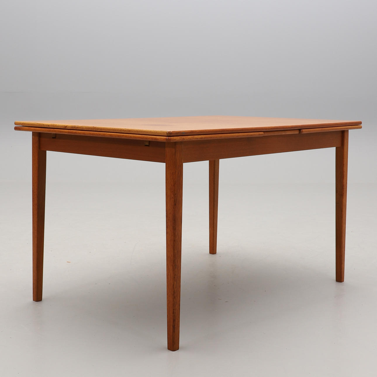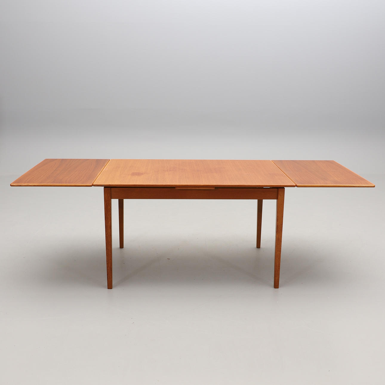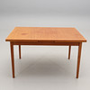 Teak. Suorakaiteen muotoinen hollantilainen ulosvedettävä lauta, kaksi ulosvedettävää lautaa, kumpikin 53 cm. Pituus 130, leveys 86, korkeus taitettuna 74 cm.