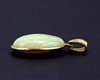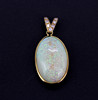 Keltainen metalli (testattu noin 18 ct) riipussetti, jossa iso soikea cabochon opaali ja timantteja, L. 4cm. Kivi L. 2,5cm.