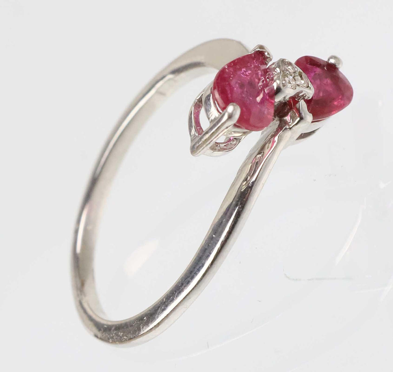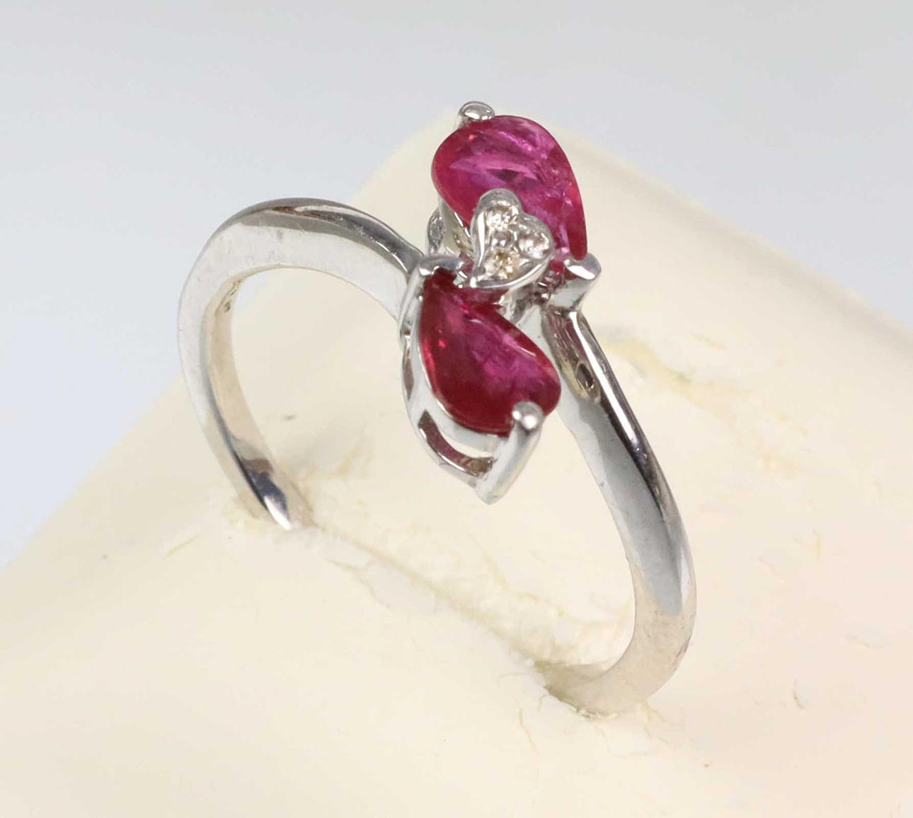 Rubiinin briljanttisormus leimattu 925 hopeaa, n. 1,9 grammaa, Croise-sormus on asetettu 2 rubiiniin, joiden arvo on noin. 6 x 4 mm päärynä leikattu kokonaisuudesta. noin 1,00 senttiä sekä 3 timanttia yhteensä. noin 0,03 ct. vuorattu, RG 53, sisähalkaisija 16,9 mm.