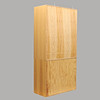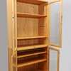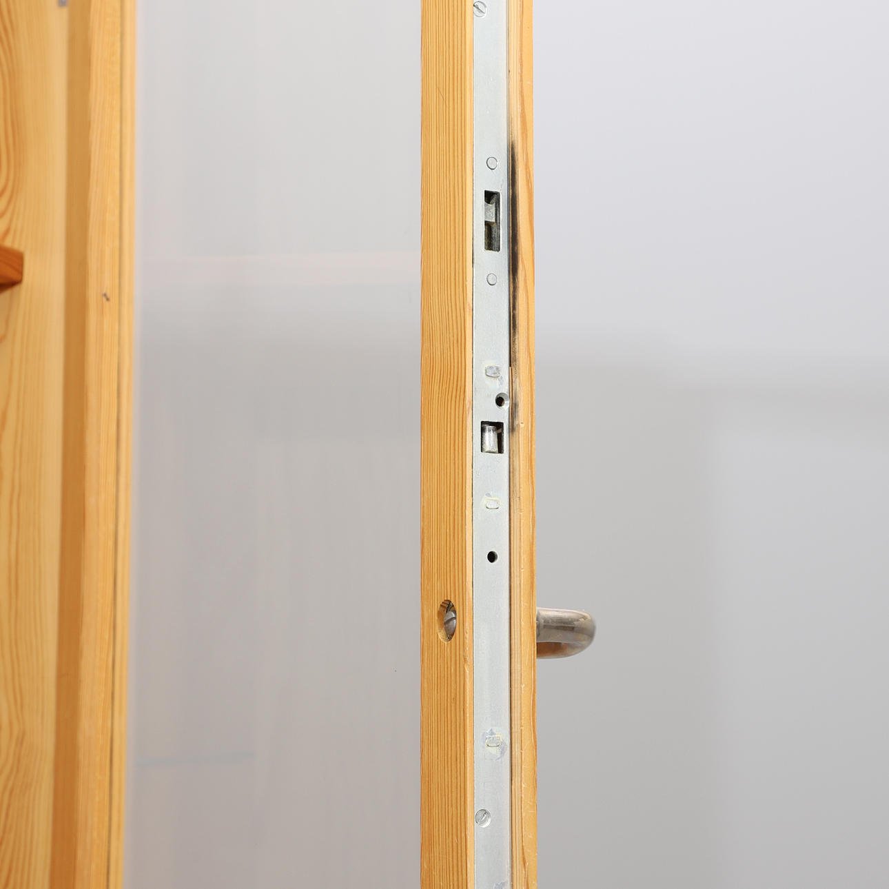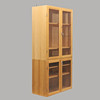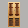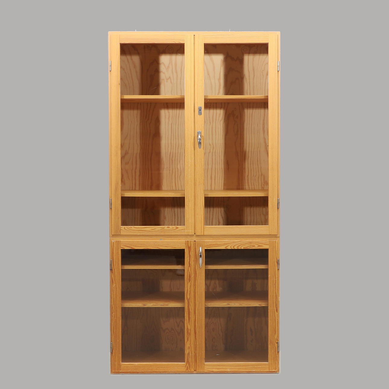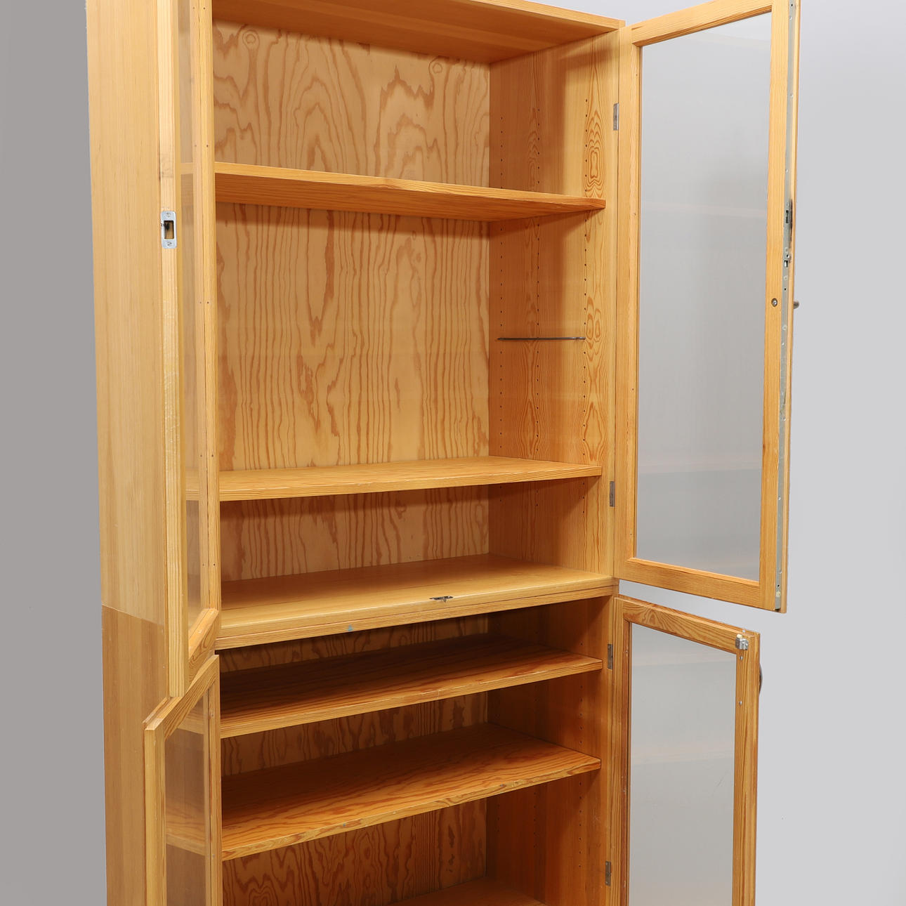 Mäntypuu. Edessä neljä lasiovea. Sisätilat irrotettavilla hyllyillä. Leveys 100, syvyys 46, korkeus 81+120=201 cm.