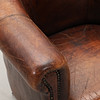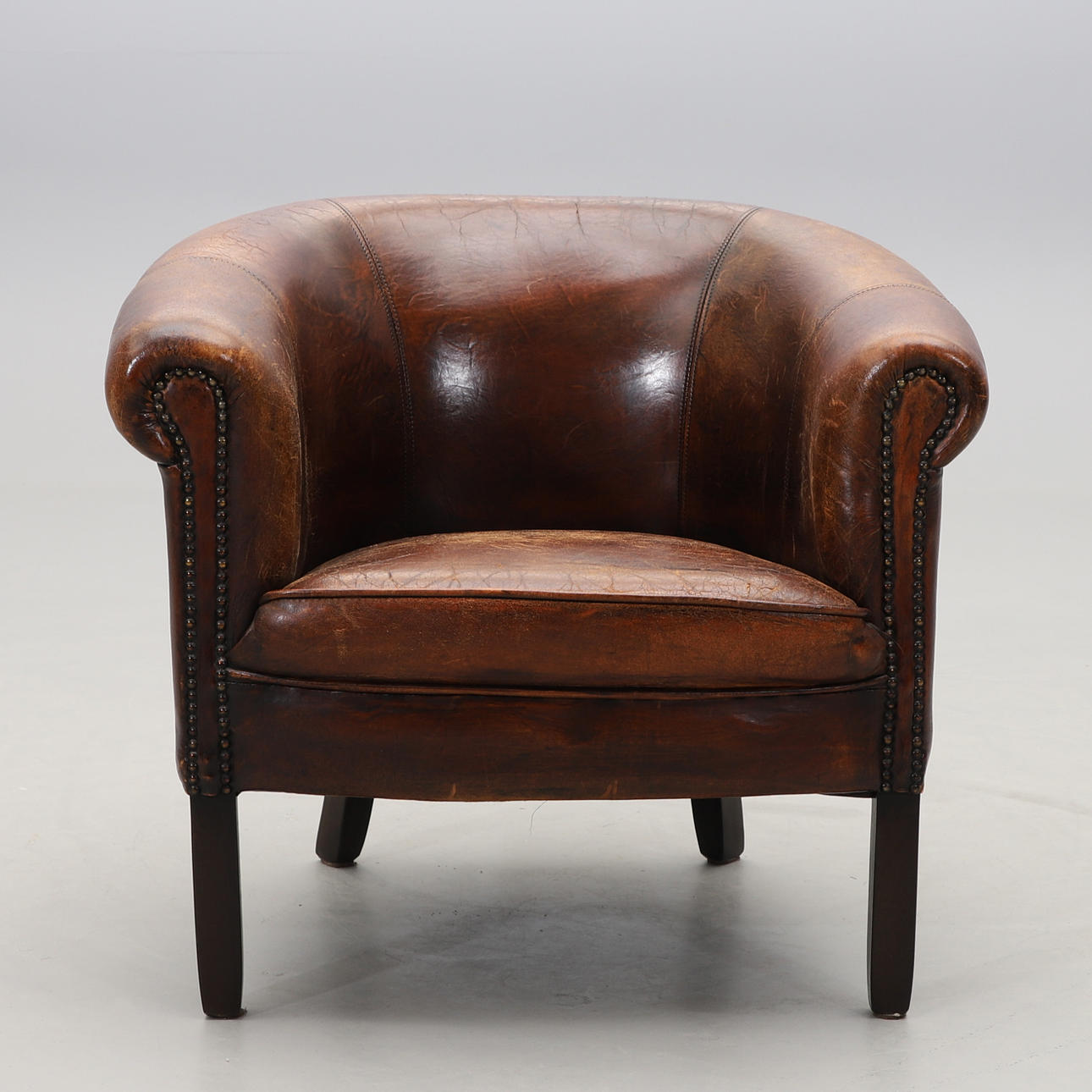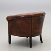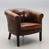 Ruskea nahkaverhoilu. Istuinkorkeus n. 40, korkeus 70, leveys 78 cm.