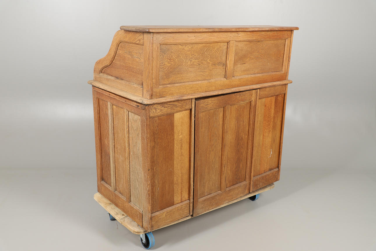 Rullataso sisältää kaksi pientä laatikot ja kyyhkynen reikiä yhden laatikon päällä kahden neljän laatikon jalustan välissä. Lukittava rullakansi avaimella. Korkeus 111 cm x pituus 122 cm x syvyys 67 cm.