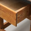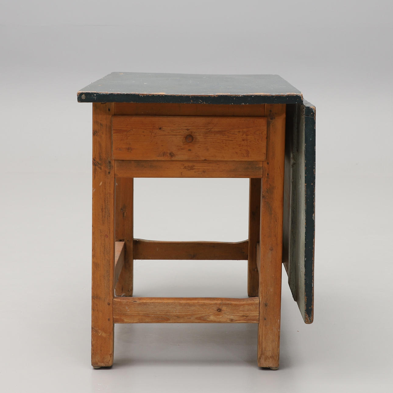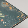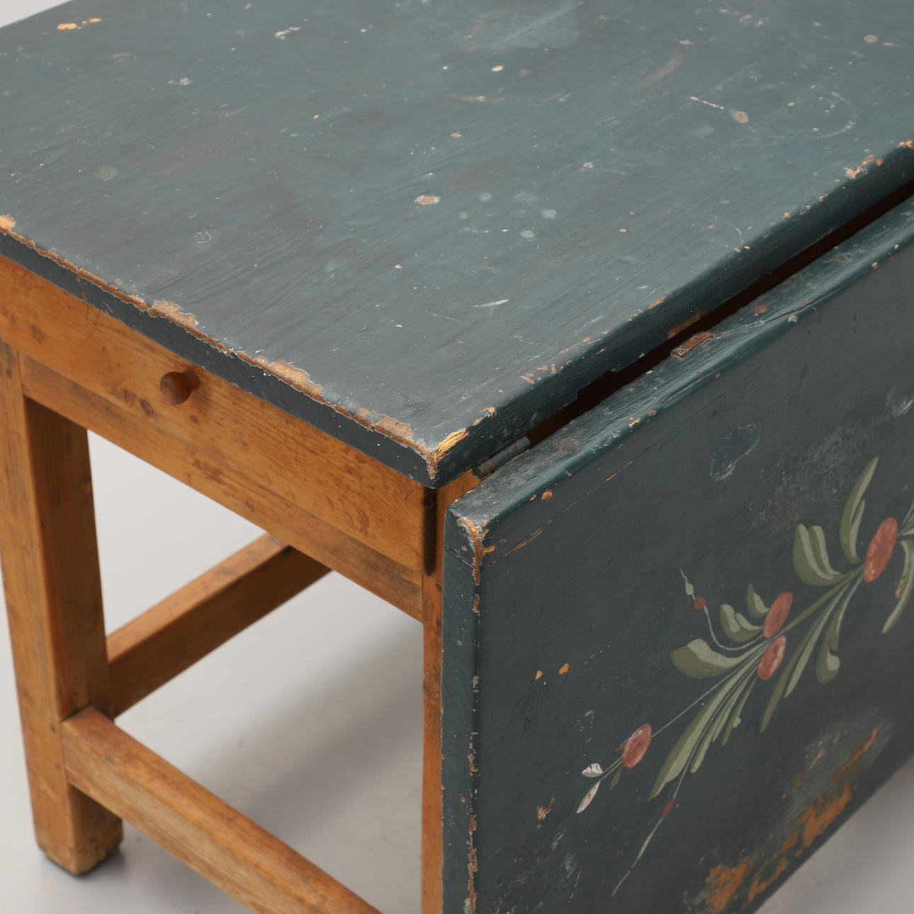 Mäntypuu. Tumman sinivihreäksi maalattu levy tyylitellyllä kukkakoristeella. Saranoitu läppä. Helmalaatikossa. Kokonaispituus 108, leveys 84, korkeus 72 cm.