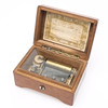 Musiikkirasia kahdella melodialla. Puinen arkku intarsialla. Teos sisäänrakennettu lasin taakse, etiketti kannessa visiirillä, vedetään ylös alta.