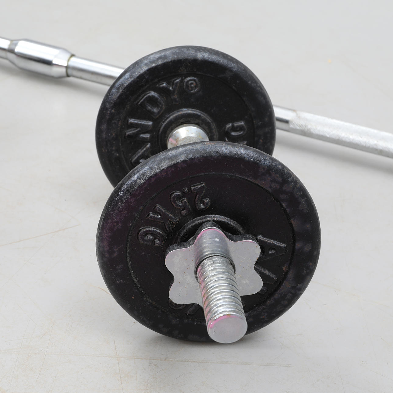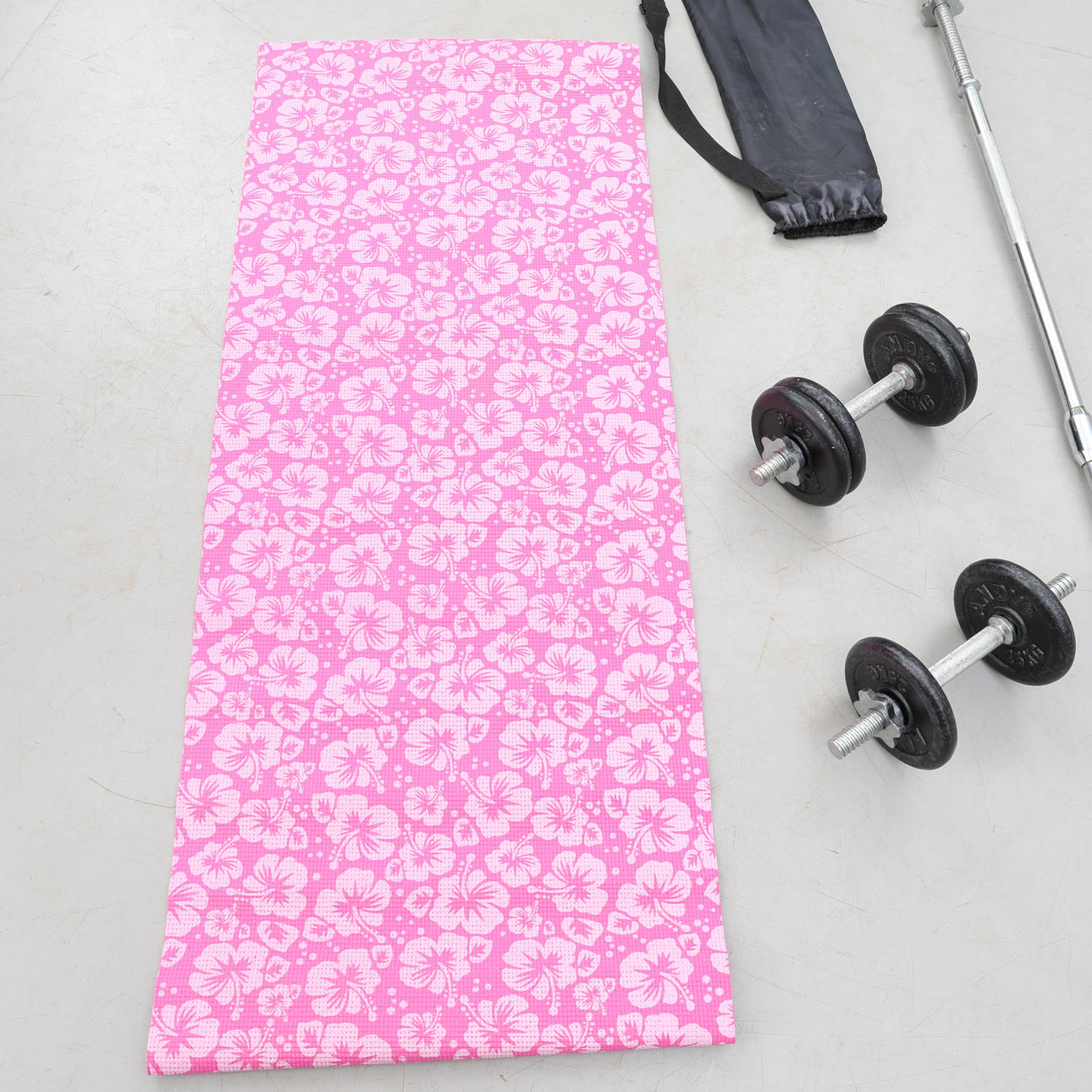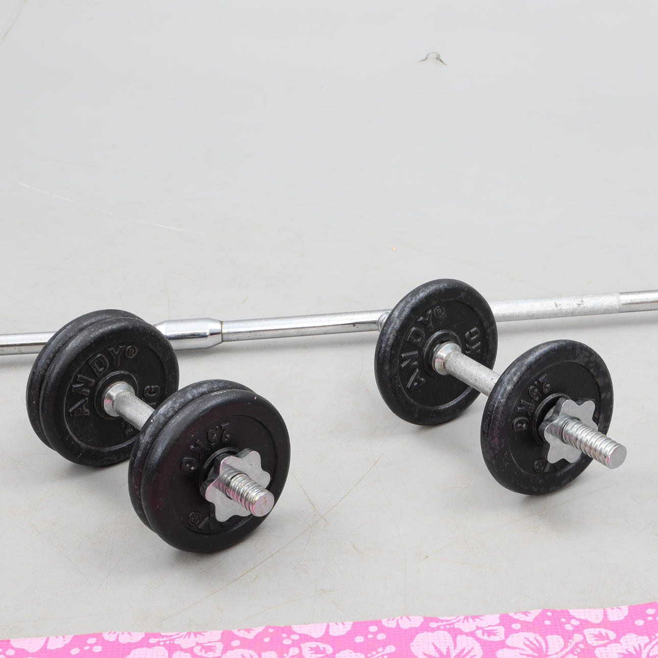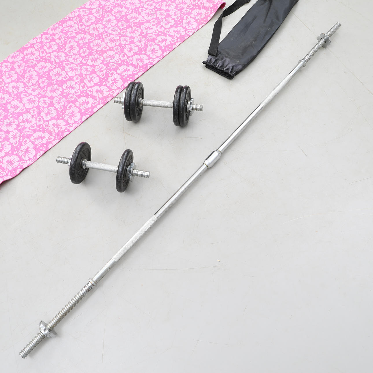 2 käsipainoa pituus n. 35 cm 1 tangon pituus n. 182 cm 6 painoa 2,5 kg/kpl 1 joogamatto.