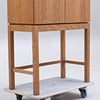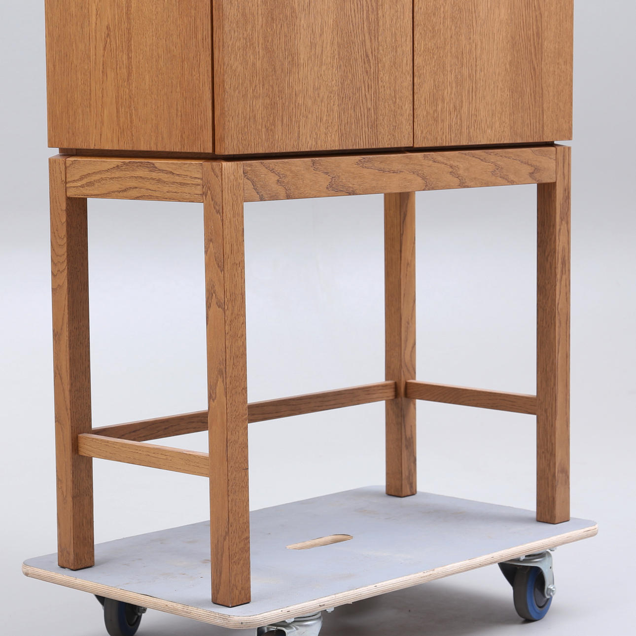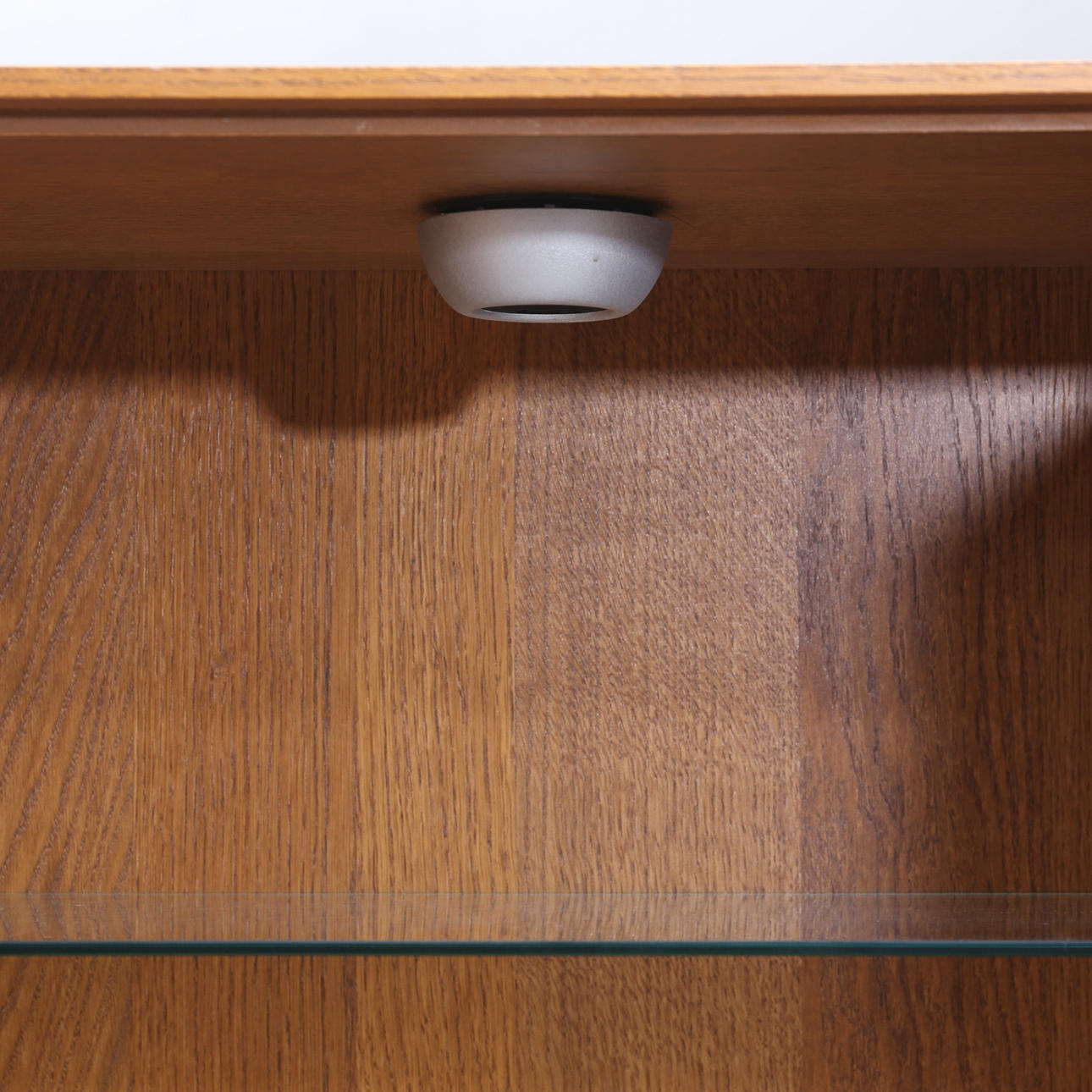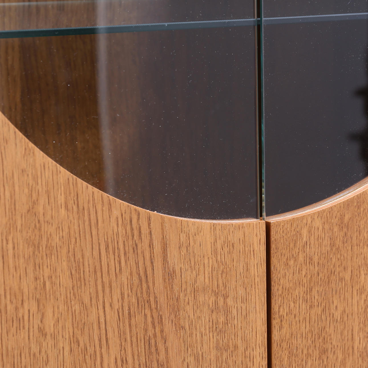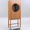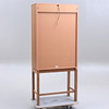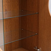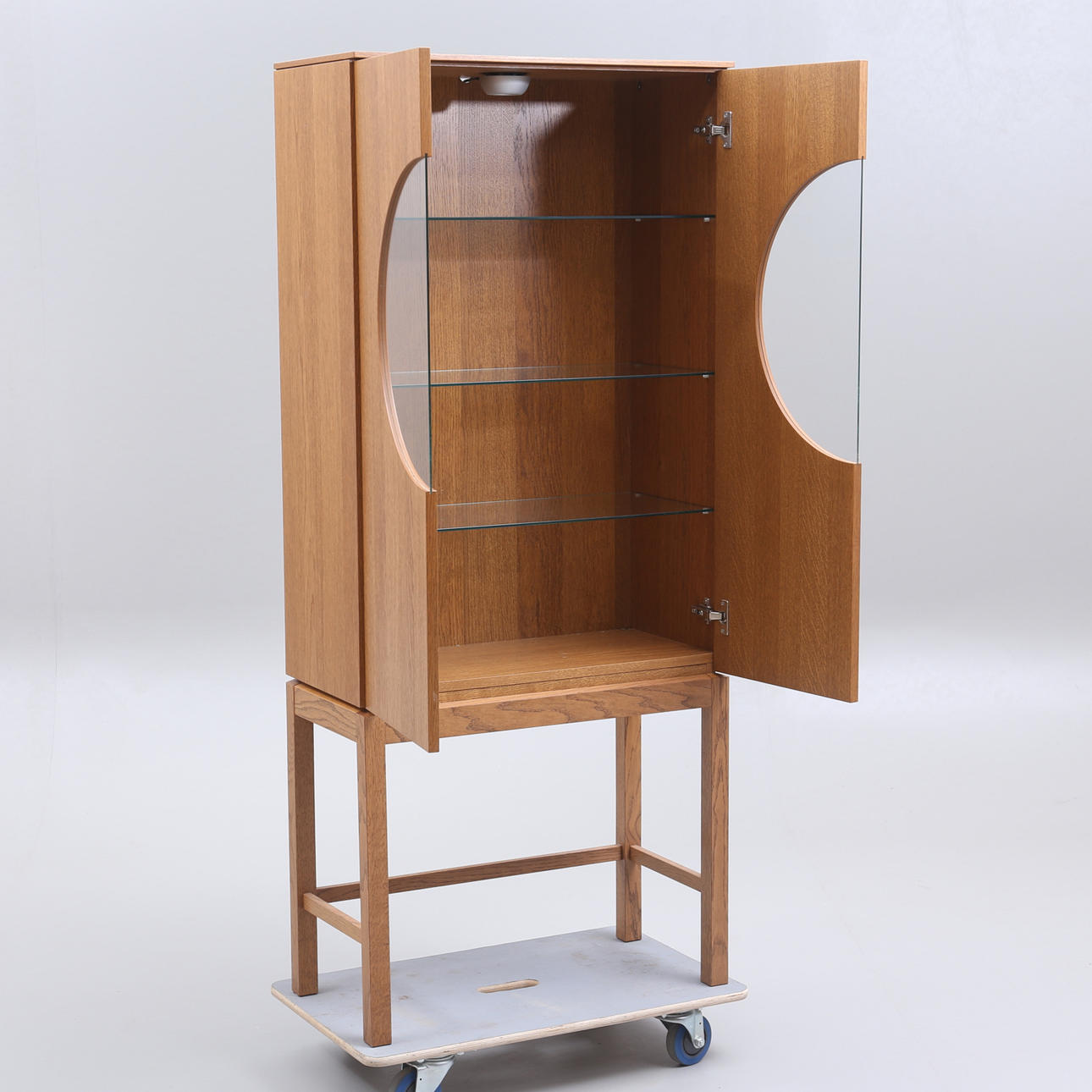 Korkeus noin 172 cm. Leveys 75 cm. Syvyys 37 cm. Ovissa ja lasihyllyissä osittain lasia.
