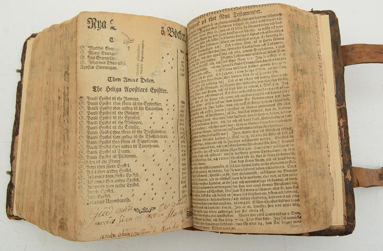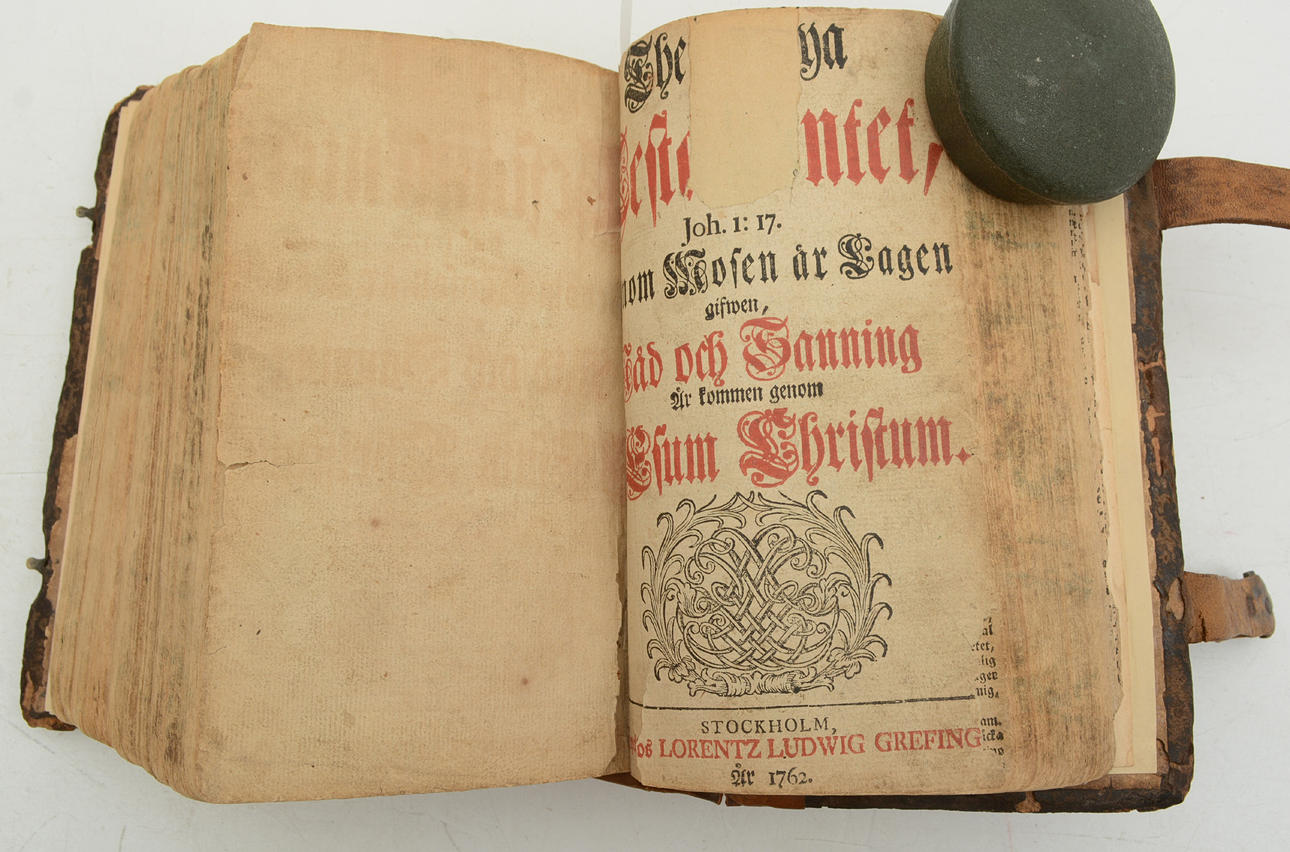 Biblia, Pyhän Raamatun kirja, Vanha ja Uusi testamentti, ruotsiksi: aikaisempien tarkkojen painosten vertailu; yhteenvedoissa ja yhteensopivuuksissa nora jätti huomiotta ja monet virheet korjattiin; jemte täydellinen hakemisto ja raamatullinen kronologia: kuten ja kalustettu herra Andreae Berghiin kanssa. Esipuhe. kanssa congl. Toukokuun armollisin lupa, Tukholma, painettu Lorentz Ludwig Grefingissä. 1762. 1136s, 334s Korjaa kannen ja nimilehden. kirjoitukset lyijykynällä.