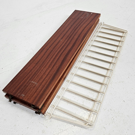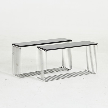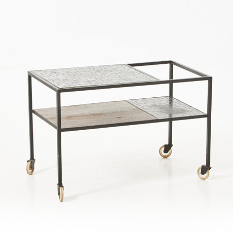 Mustaa puuta ja keltaista metallia. Jalkojen päät pyöränpyörillä. 3 hyllyä. Pituus n. 45 cm, leveys n. 28 cm, korkeus n. 93,5 cm.