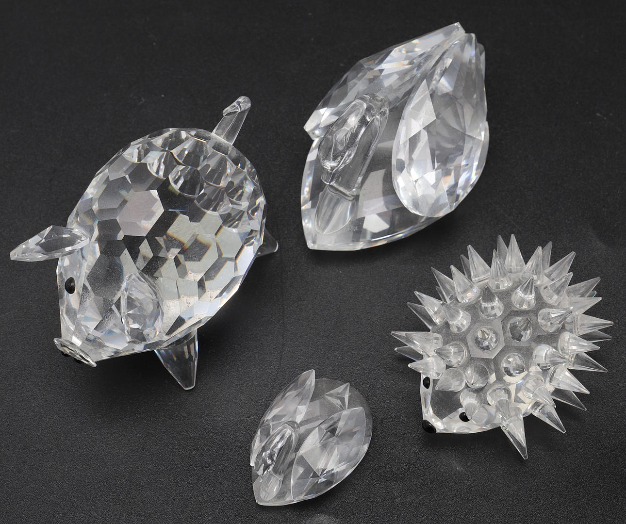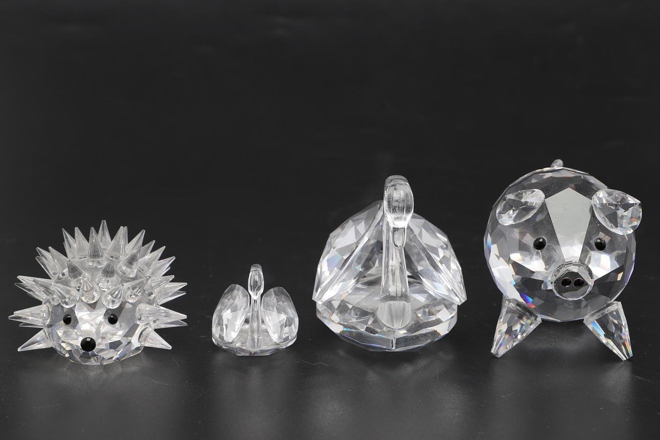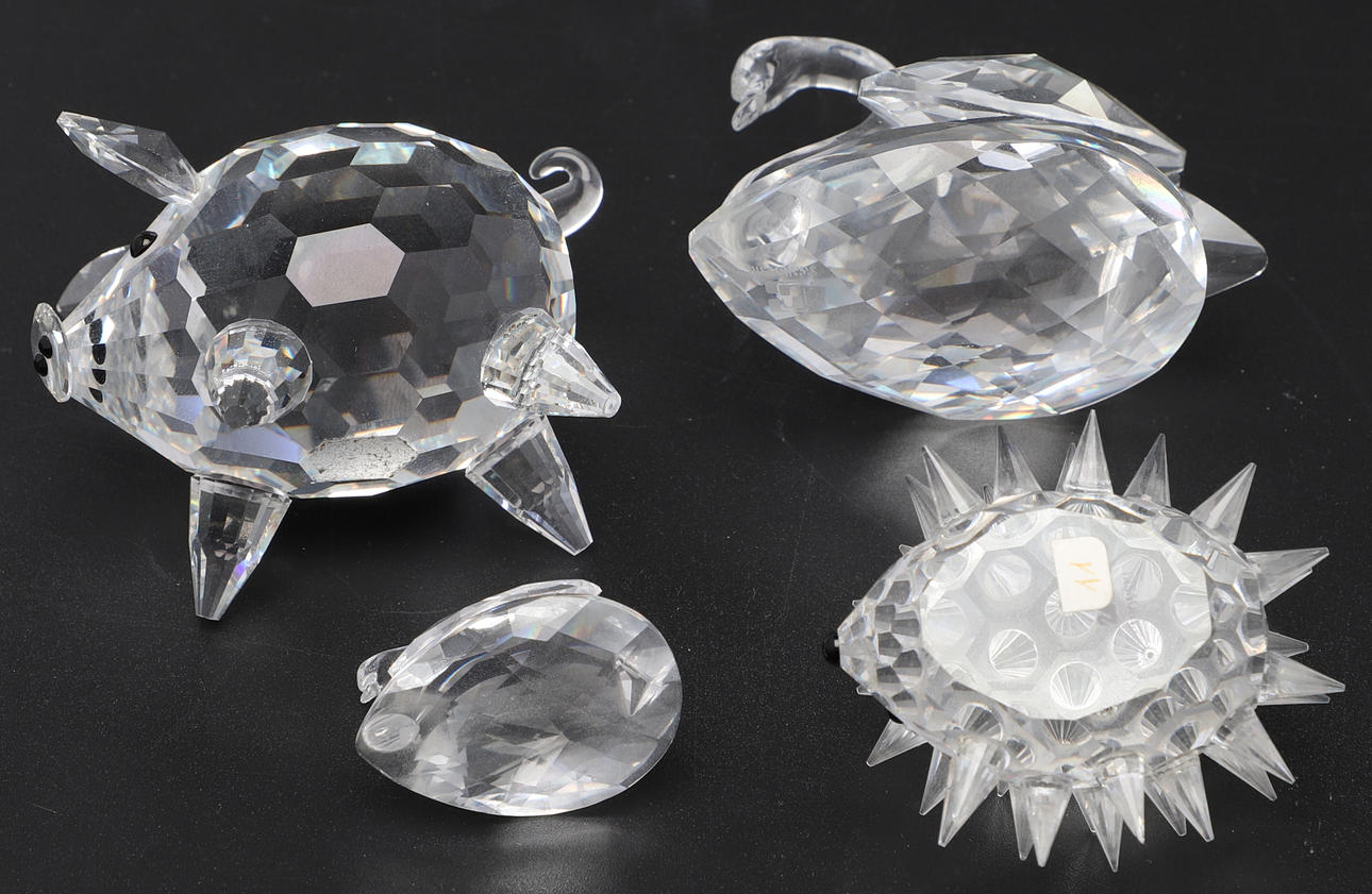 2 joutsenta, korkeus n. 3-5,5 cm. Siili, pituus n. 5,5 cm. Possu, korkeus n. 5 cm.