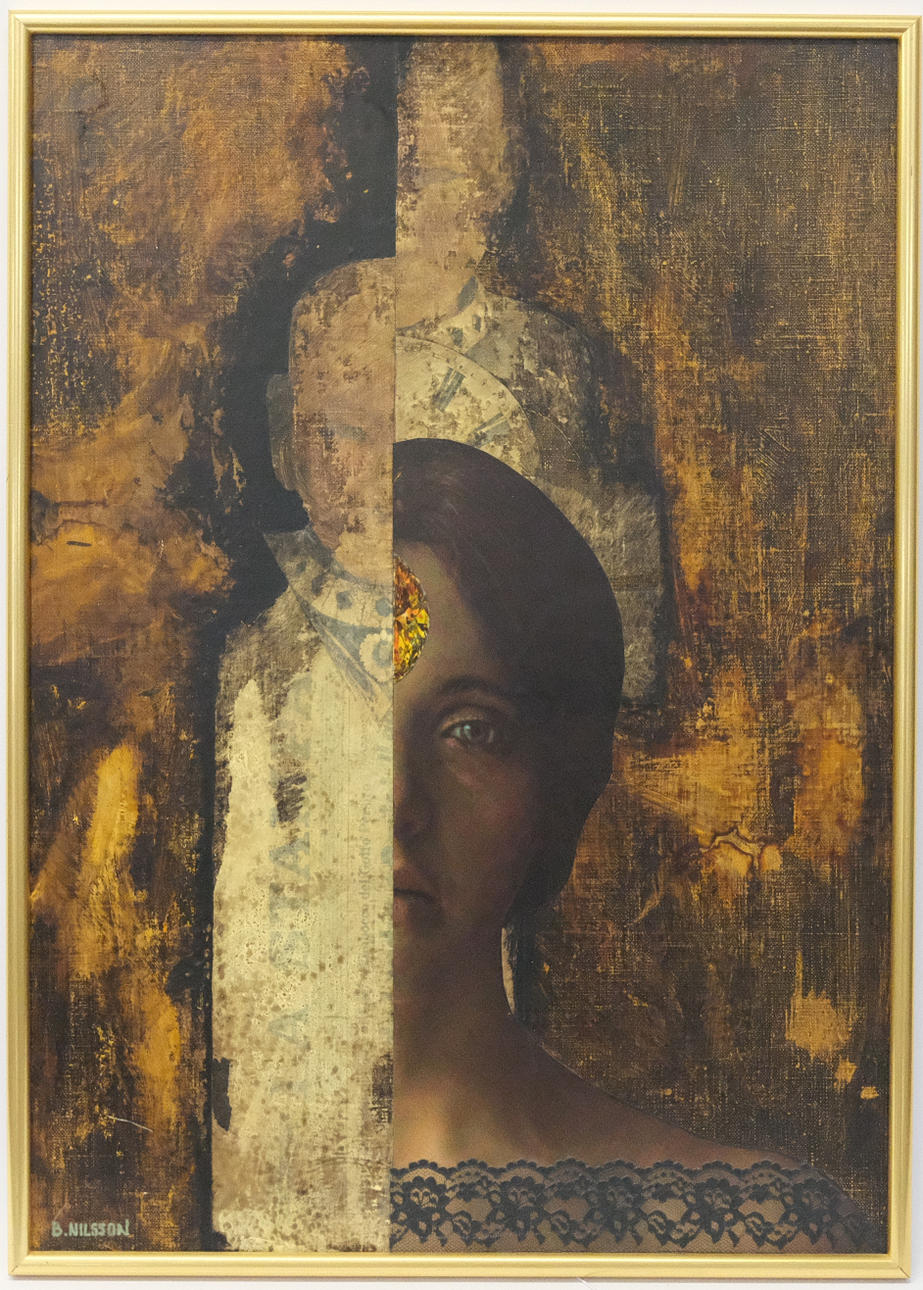 Koostumus kasvojen kanssa. Allekirjoitettu B. Nilsson. Kuvan mitat: noin 69 x 49 cm. Kehyksen mitat: noin 70 x 50 cm.