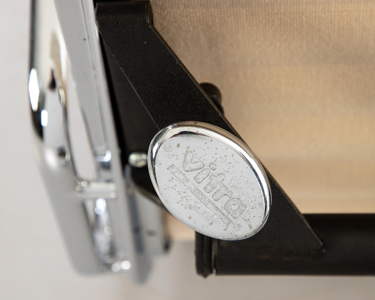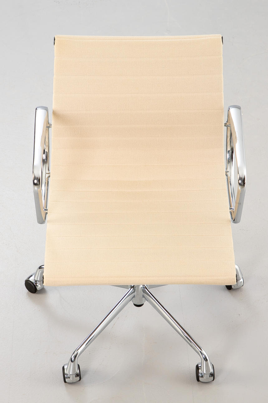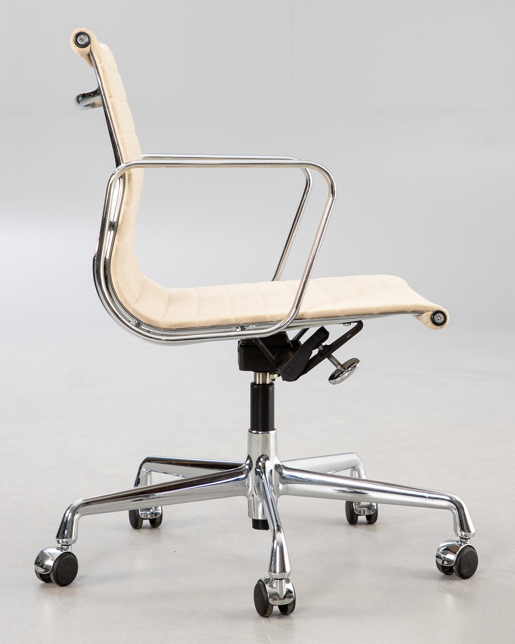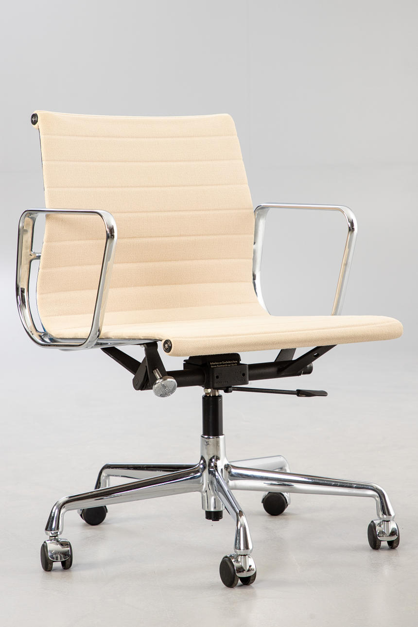 Työtuoli Alu Chair 'EA117' Ray & Charles Eames Vitralle. Luonnos: 1958. 5 tähden jalusta pyörillä painevalettua alumiinia, kromattu. Istuin on verhoiltu kermanvärisellä Hopsakilla. Korkeuden säätö kaasupainejousella. Sisäänrakennettu keinumekanismi. Nimetty.
