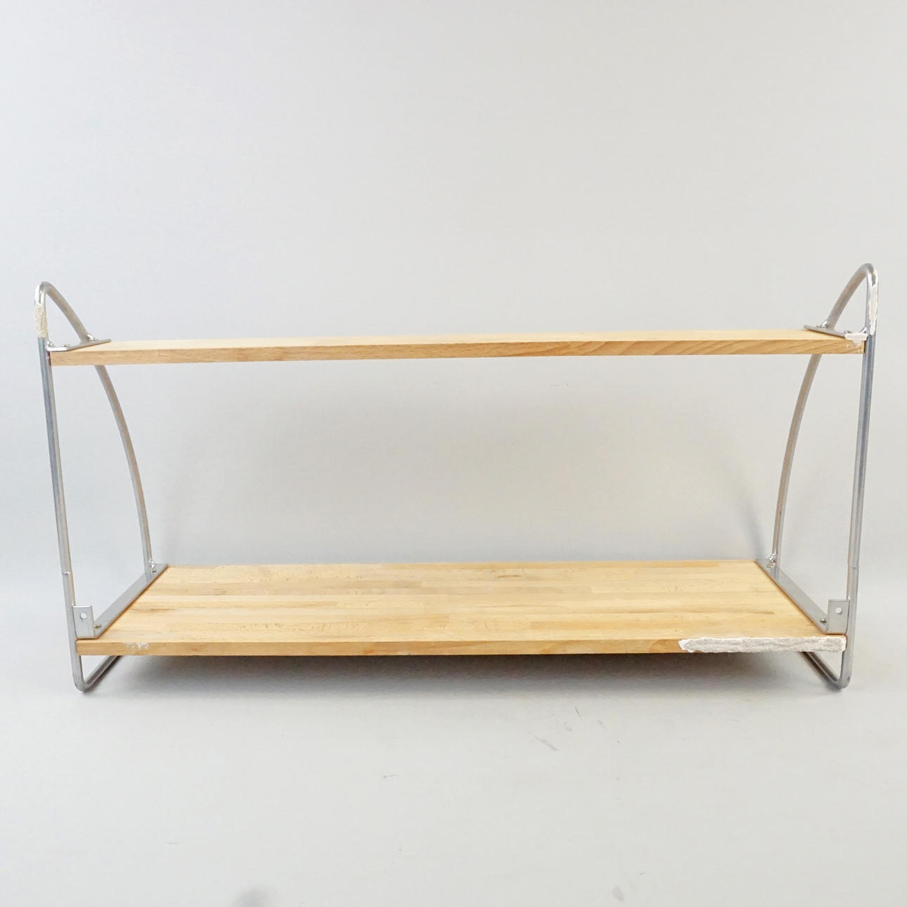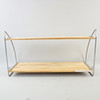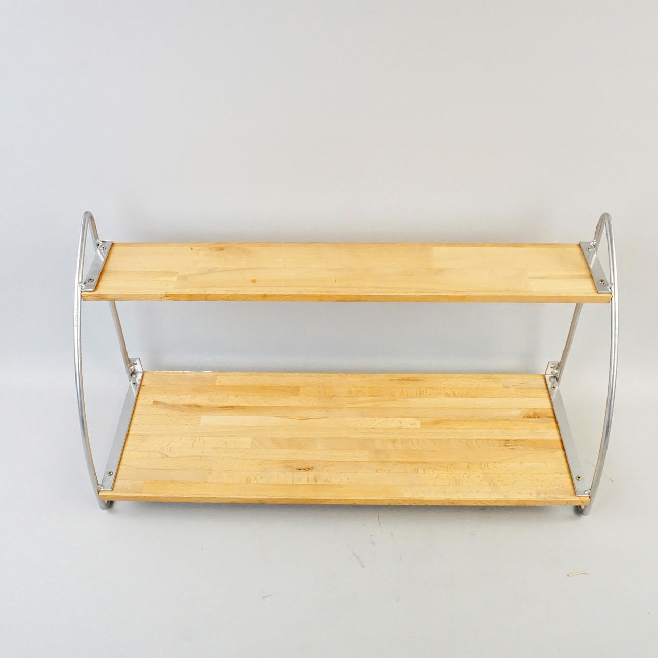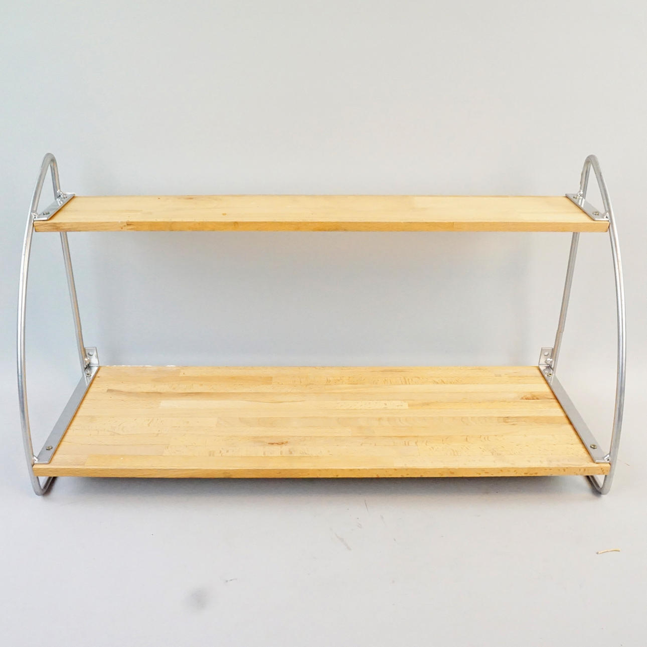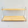 Puinen 2 tasoinen hylly metallikiinnikkeillä, pituus n. 60 cm, syvyys n. 21 cm, korkeus n. 32 cm.