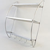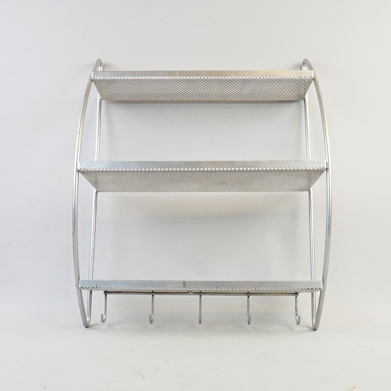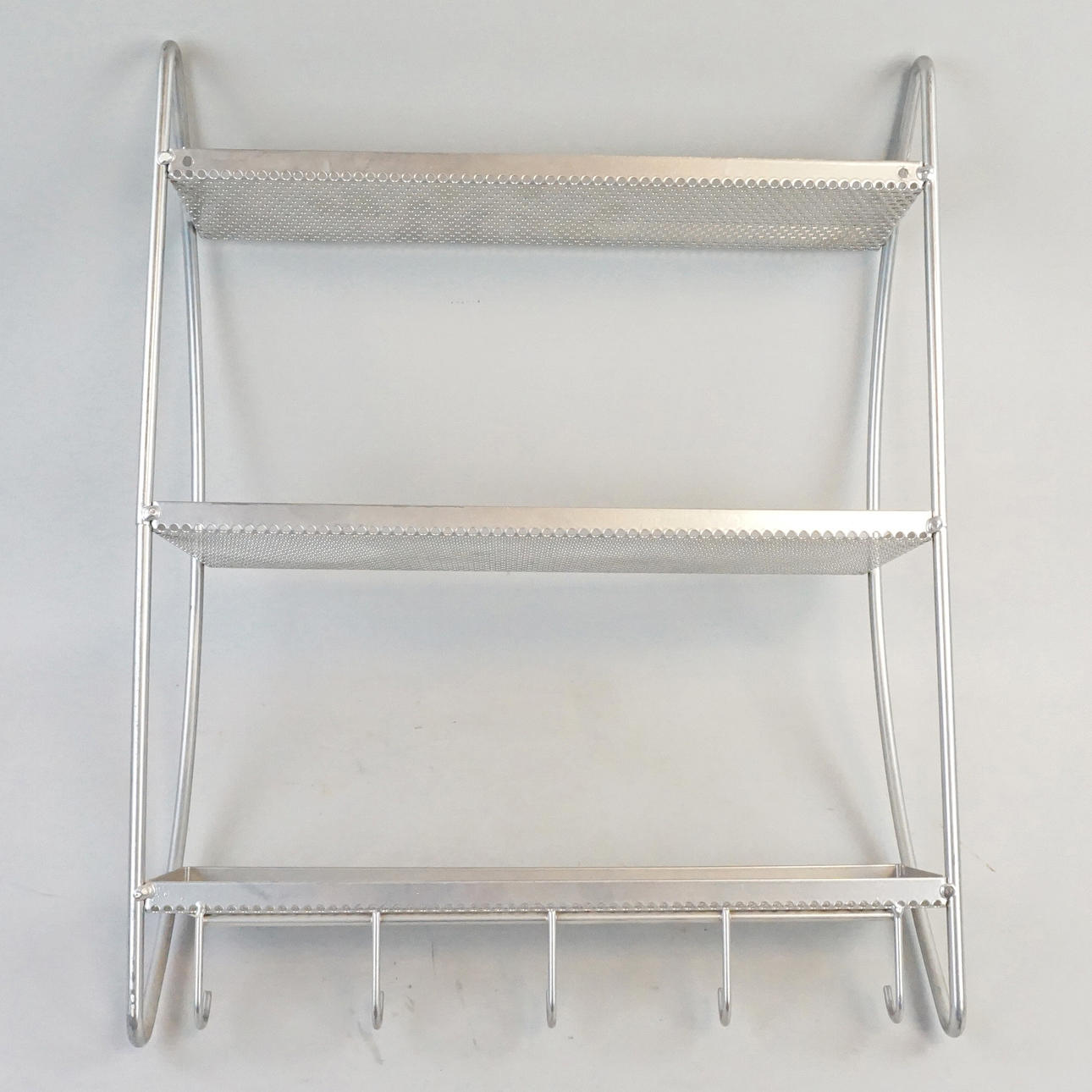 Rei'itettyä metallia oleva hylly, jossa 3 tasoa ja koukut alla, pituus n. 40 cm, syvyys n. 15 cm, korkeus n. 50 cm.
