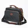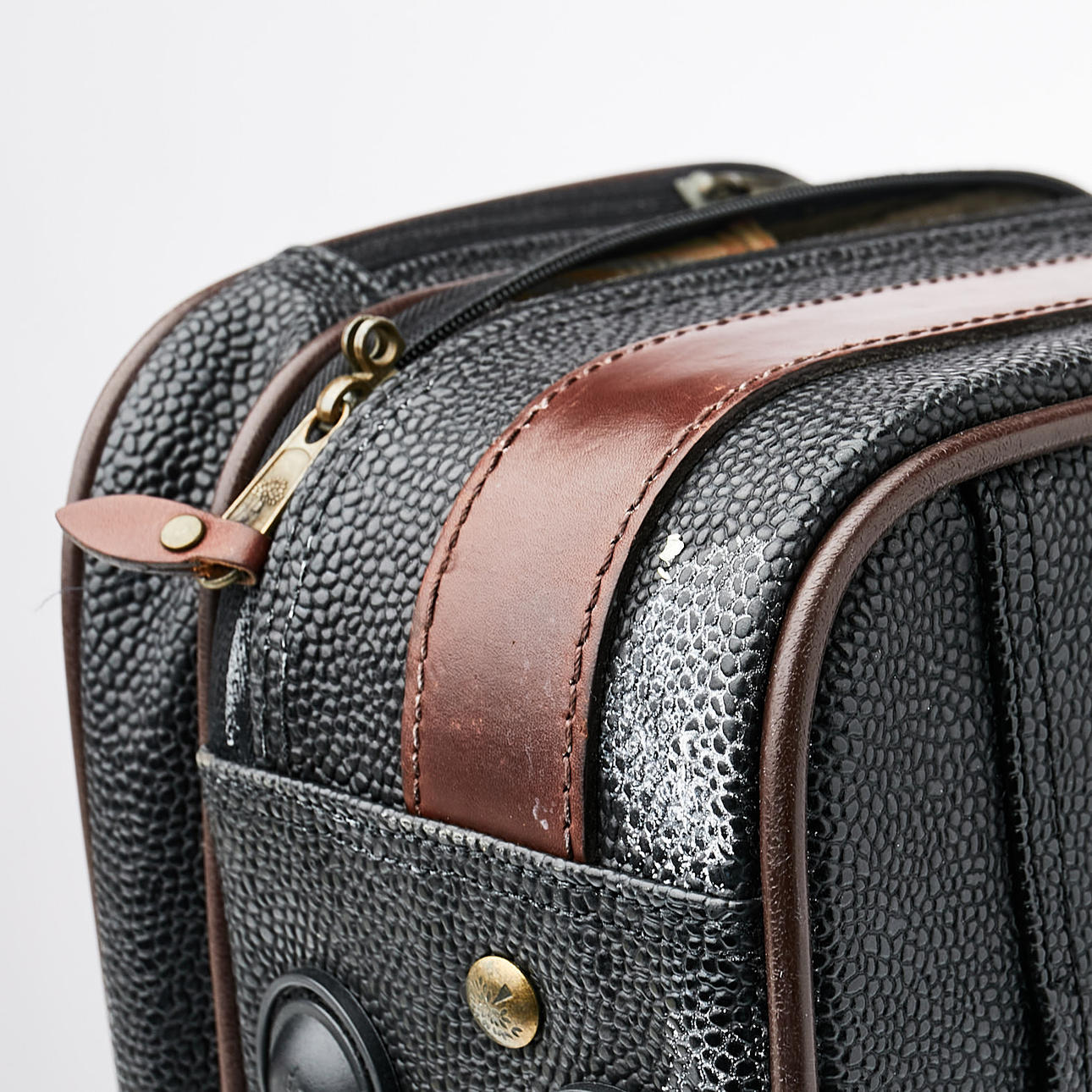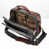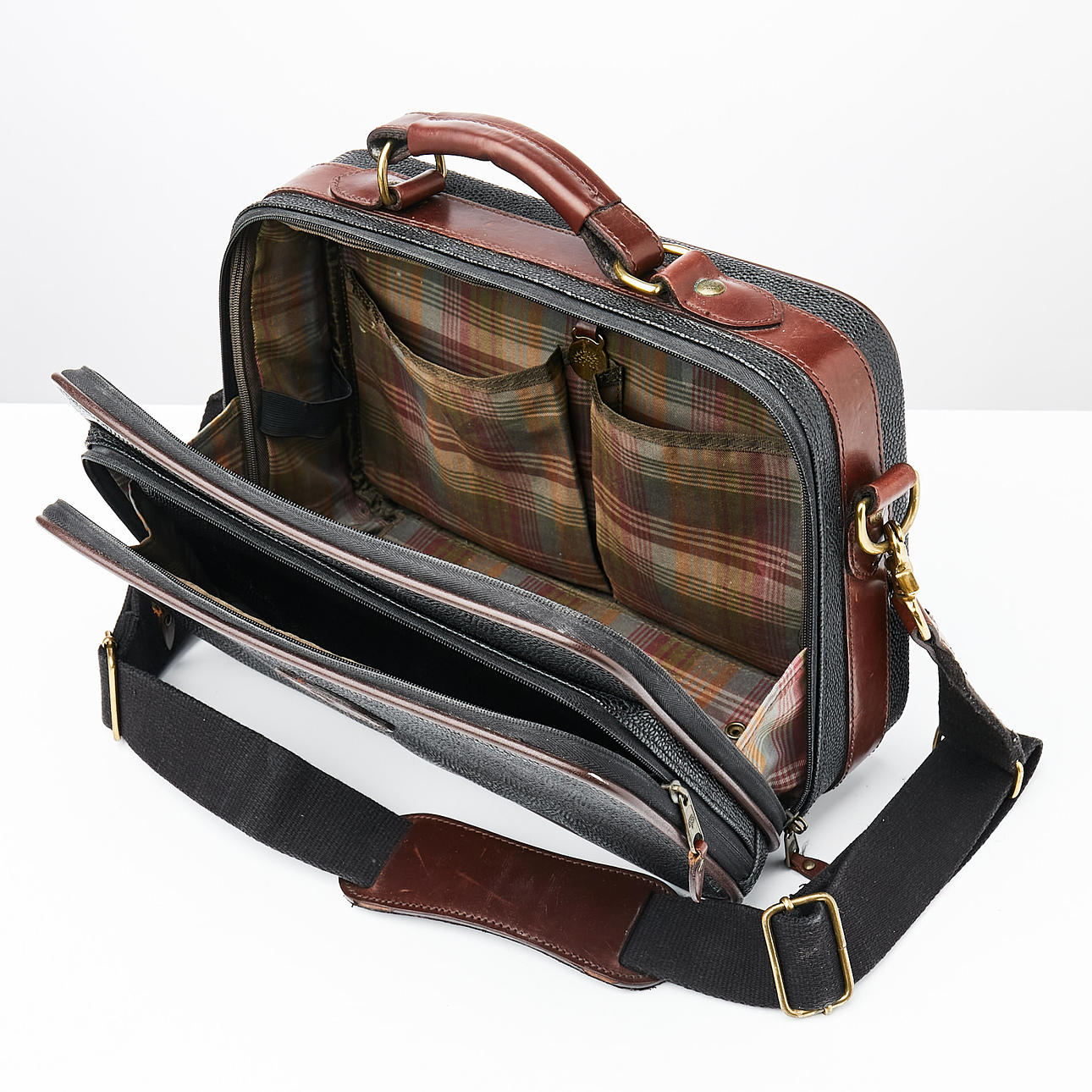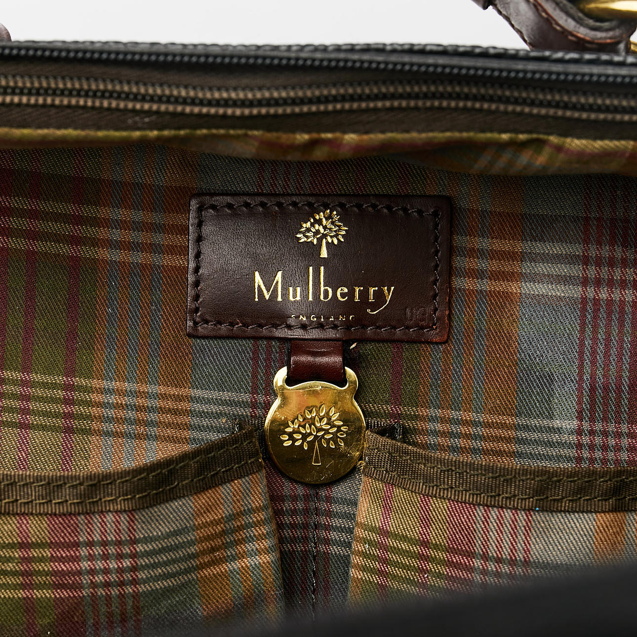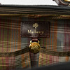 Salkku/makuupussi mustaa skotlantilaista ja ruskeaa vaatetusta, jossa yksityiskohdat messinginväristä metallia. Sisältä vuorattu ruudullinen tummanvihreä vuori. Ulkoinen vetoketjullinen lokero. Päälokerossa kaksi avointa sivutaskua, joustavat kuminauhat päissä ja verkkotasku. Takana ristiläppä integroidulla taskulla käsilaukun kahvan kiinnitystä varten. Etiketti ja laatta merkitty Mulberry England, 069516. Mitat: n. 36x25, syvyys n. 14 cm.