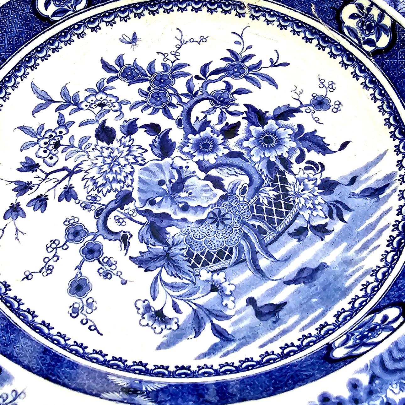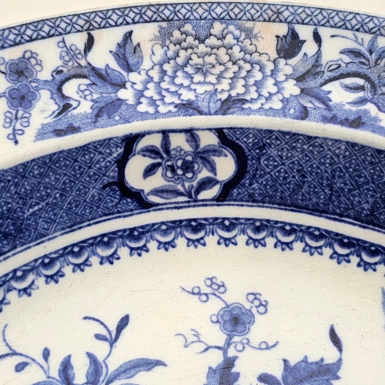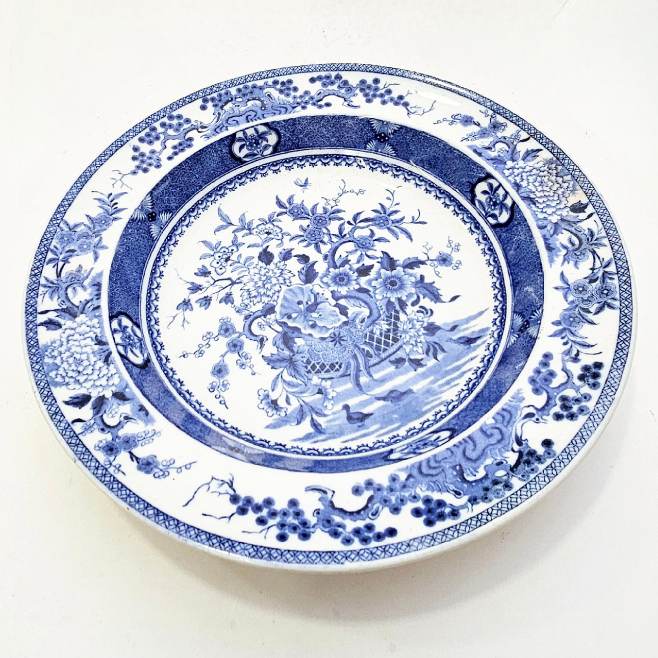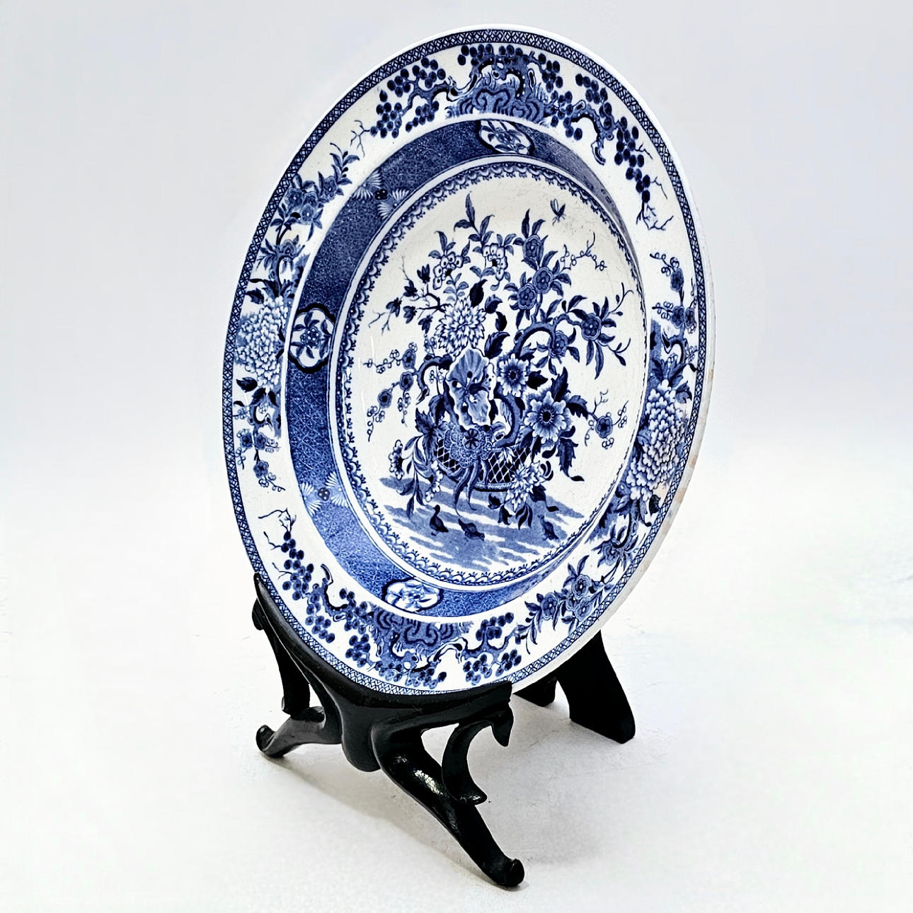 Orientalistinen aihe ja sinivalkoinen. Mitat: 4,5x25 cm. Itämaisella puisella pohjalla: 13x14,5x12 cm.