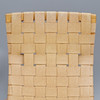 Merkki, pyökkirunko, jossa punottu satulavyö. Selkäkorkeus 100 cm, leveys 65 cm, istuinkorkeus 26 cm.