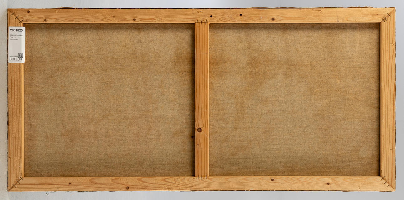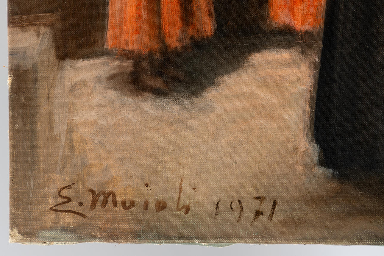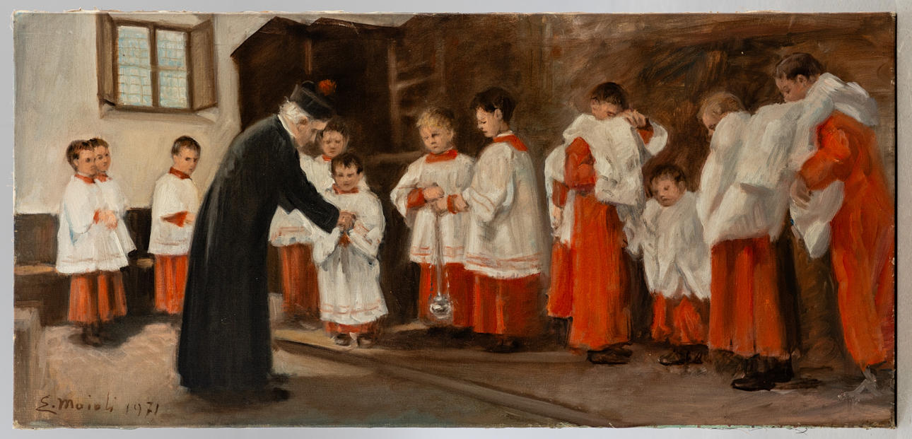 Ezio Moioli da Olcio (1902-1981), alttaripoika, öljy kankaalle, 1971, signeerattu ja päivätty alhaalla vasemmalla, n. 45x95,5 cm.