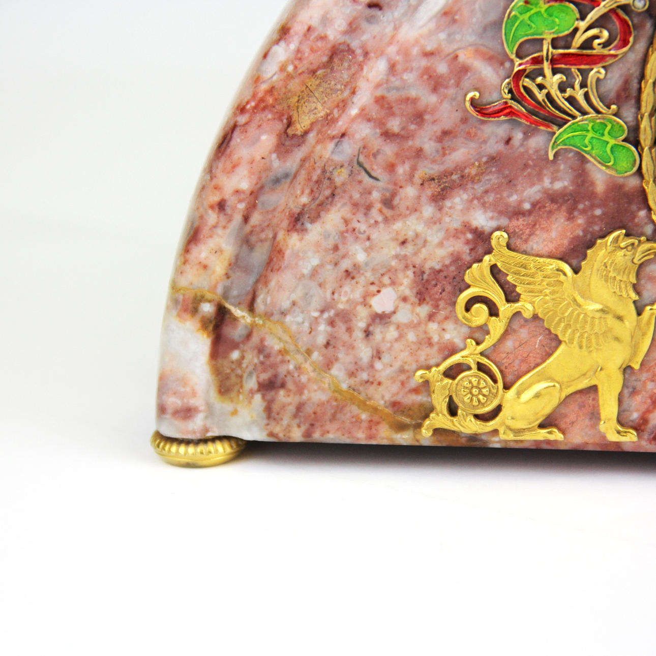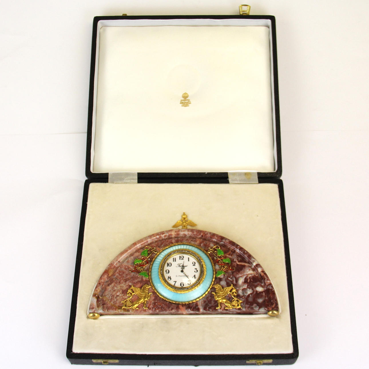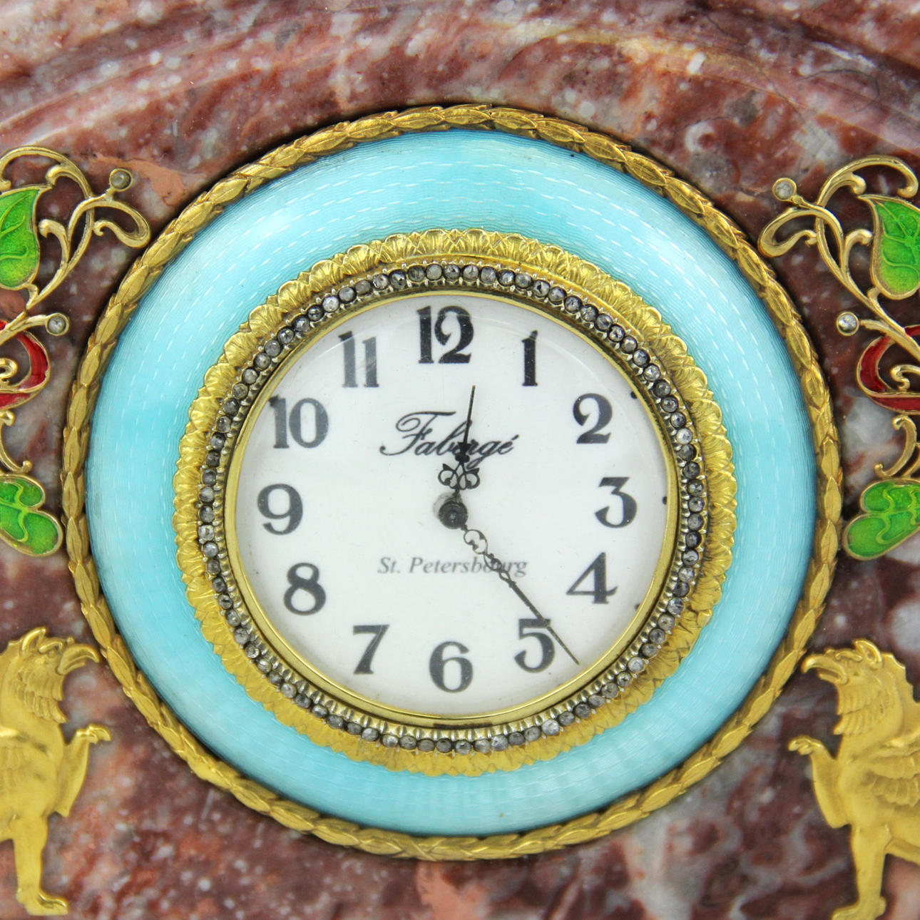Faberge-marmorikello, koristeltu hopeakullauksella, emalilla ja timanteilla, kello leveys 21,5 cm.