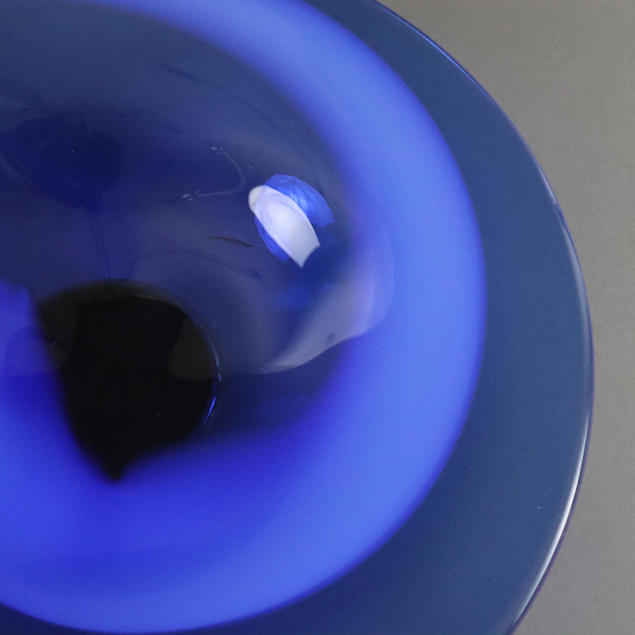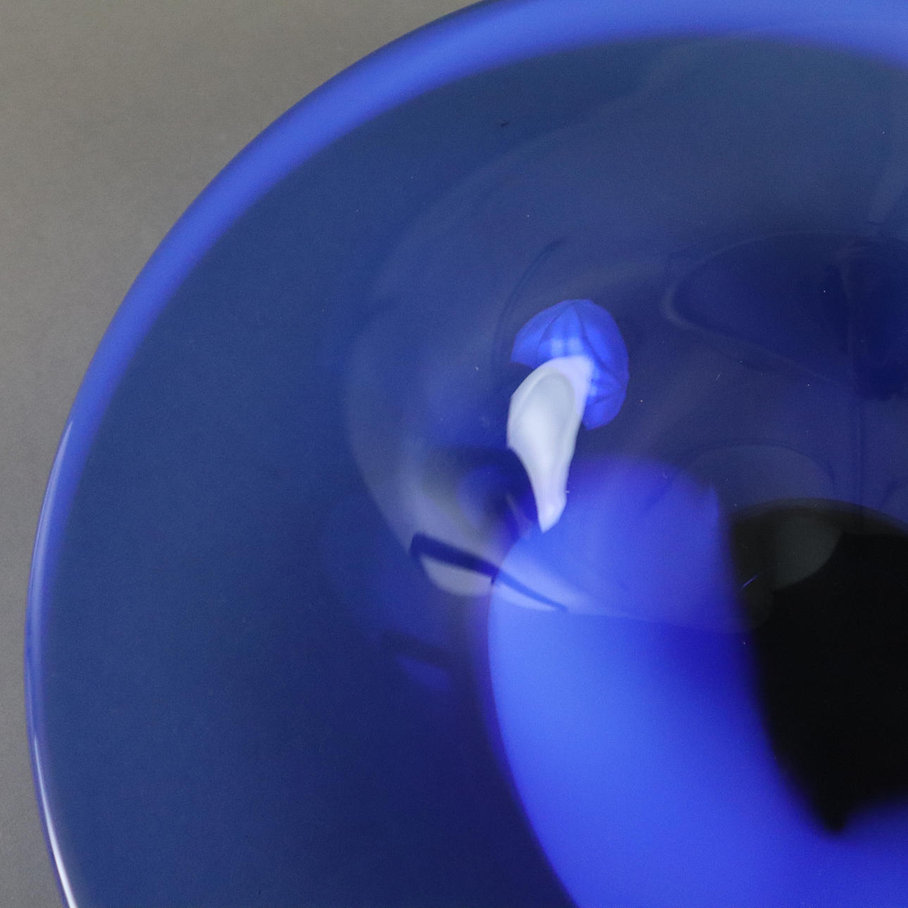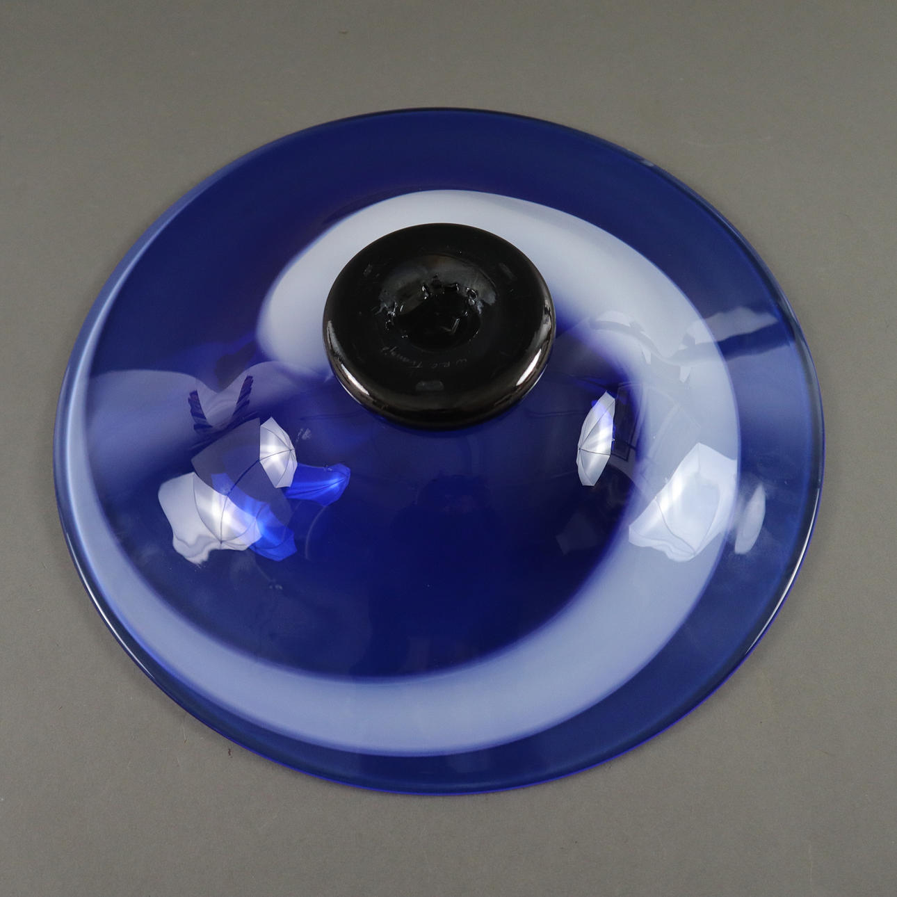 Paksuseinäinen lasi, jonka väri sulaa koboltinsinisenä ja opaalinvalkoisena, naarmuuntunut allekirjoitus "WRC Transjö " (Anne Wolff, Jan-Erik Ritzman, Sven-Ake Carlsson), H x S: n. 7 x 33 cm.