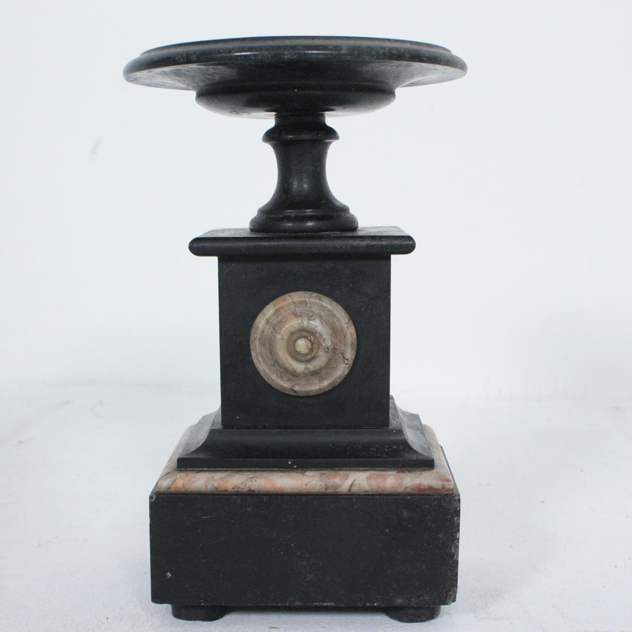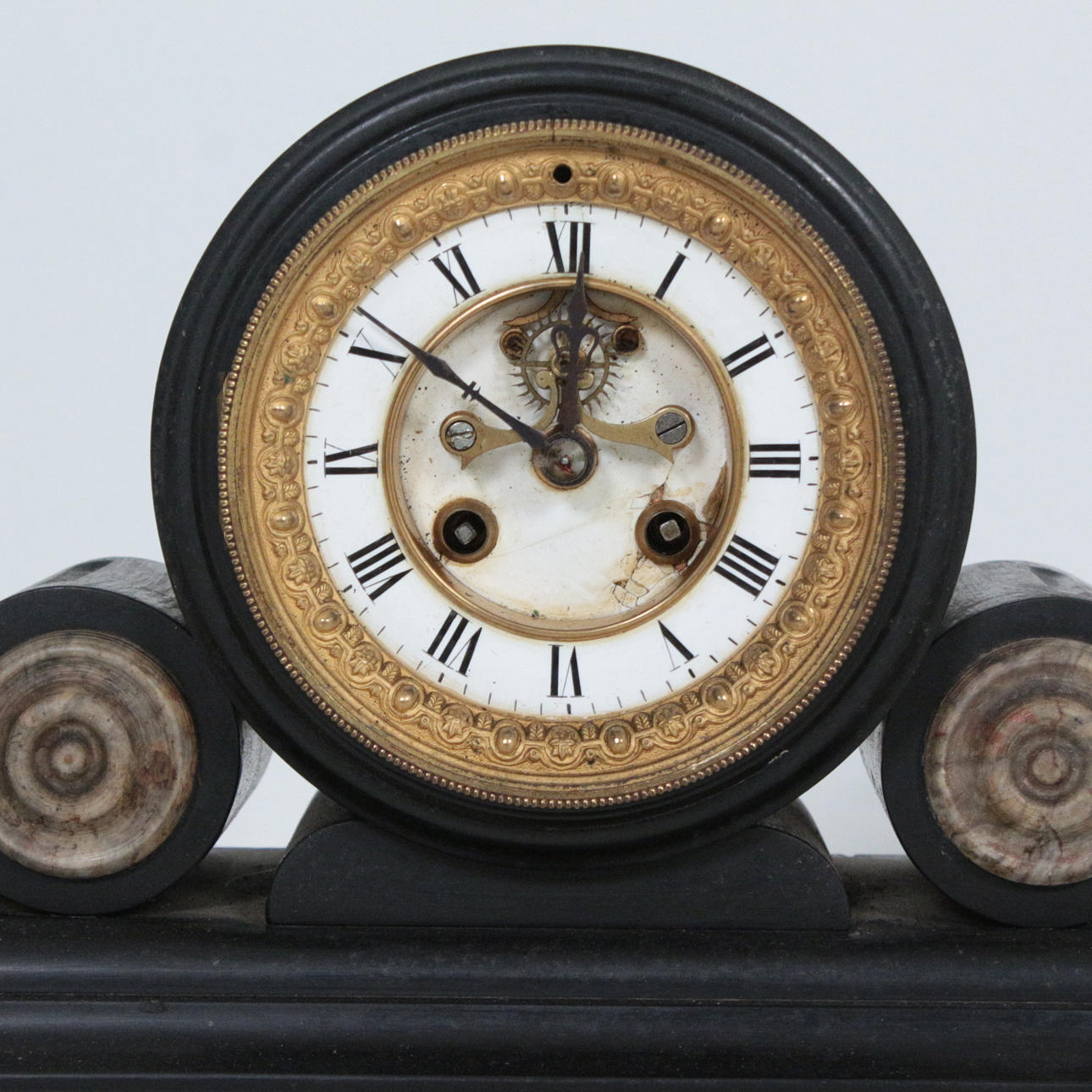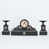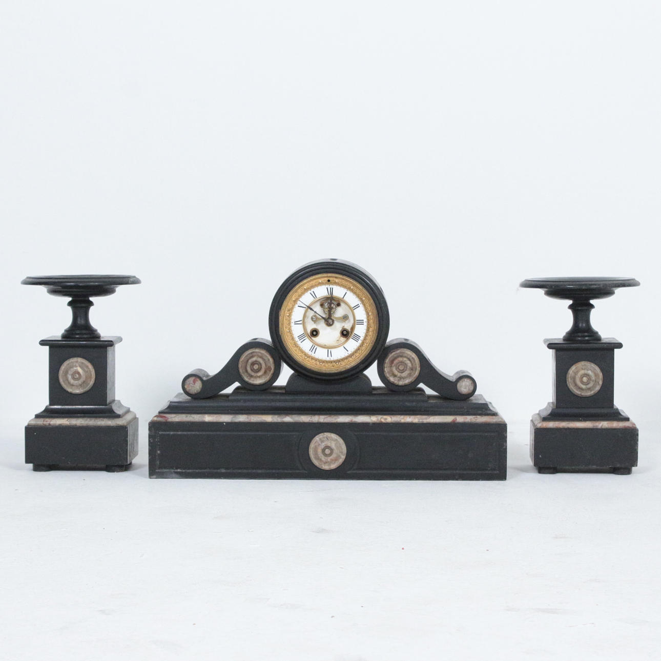 Mantelkello kahdella sivulevyllä, marmori, kivi, mitat n.: K. 28 cm, L. 44 cm, halkaisija 14 cm;.