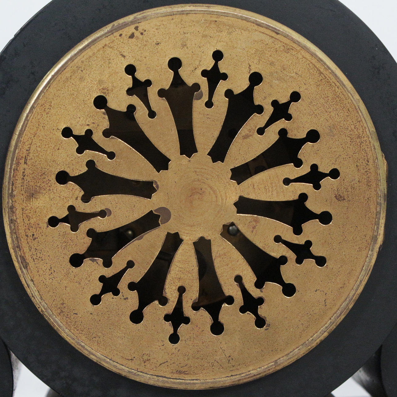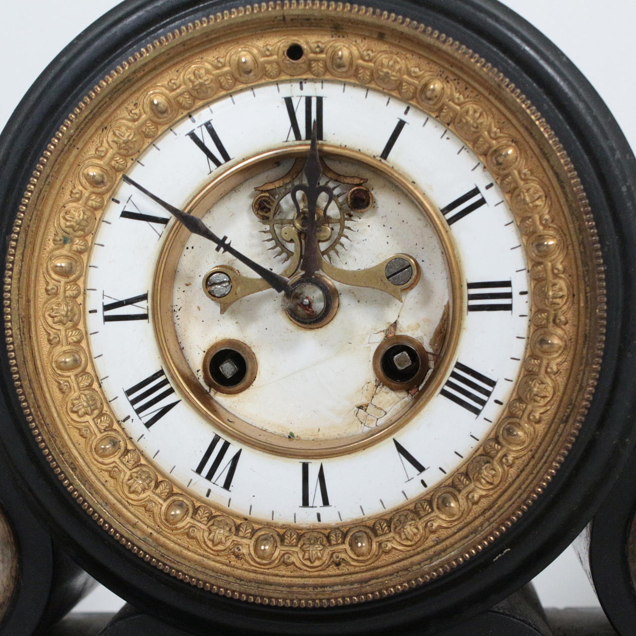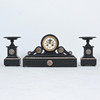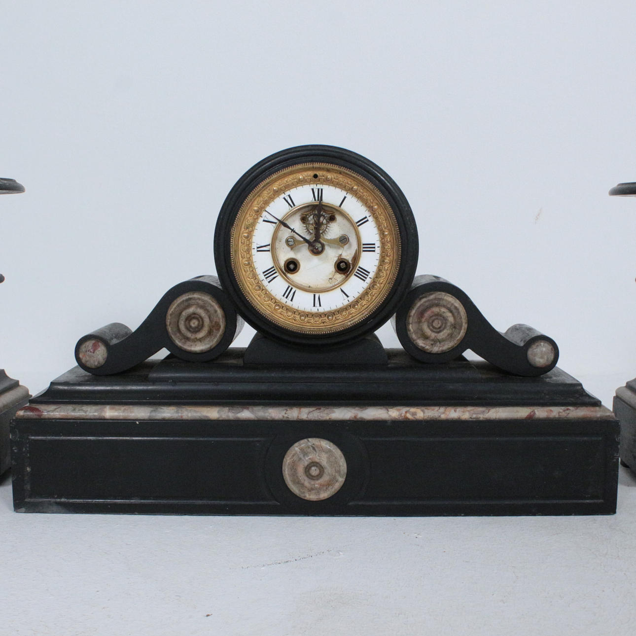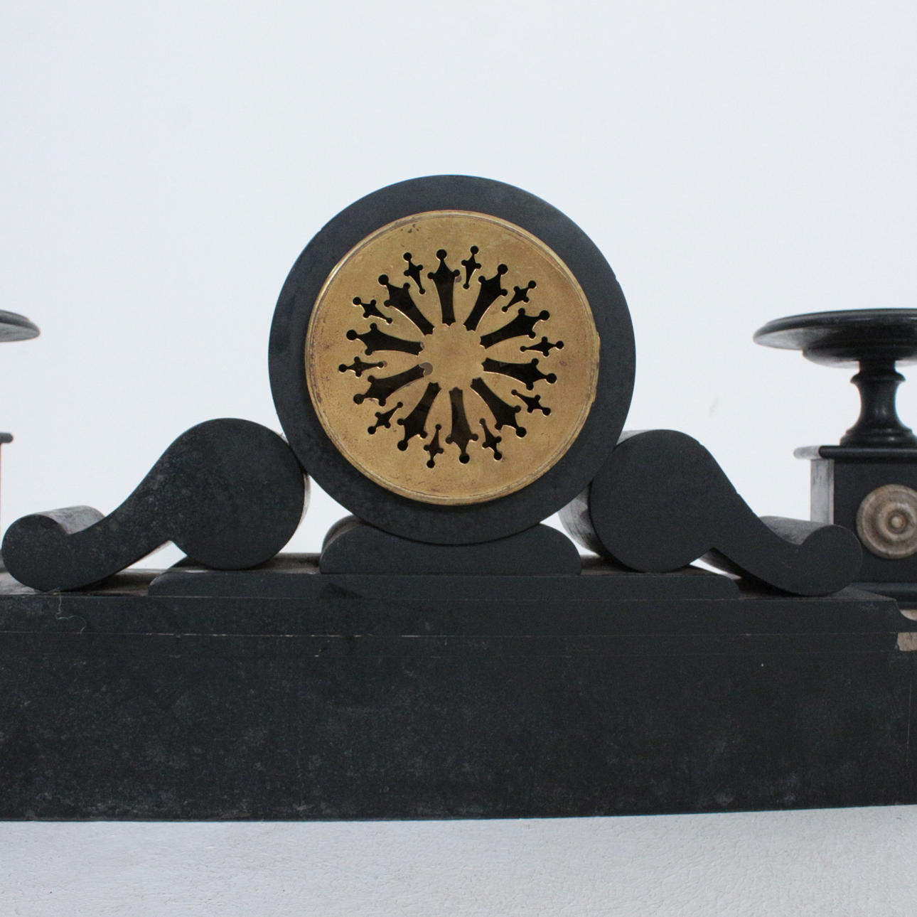 Mantelkello kahdella sivulevyllä, marmori, kivi, mitat n.: K. 28 cm, L. 44 cm, halkaisija 14 cm;.