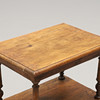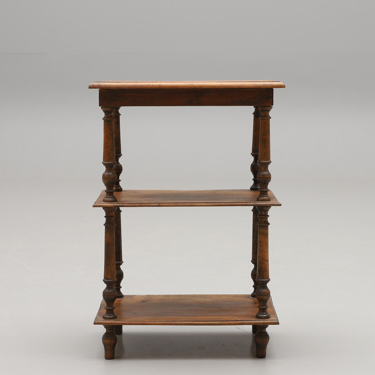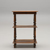 Luullinen mänty. Kolme suorakaiteen muotoista hyllyä profiloidulla reunalla, sorvatut tolpat. Leveys 52, syvyys 38, korkeus 76 cm.