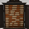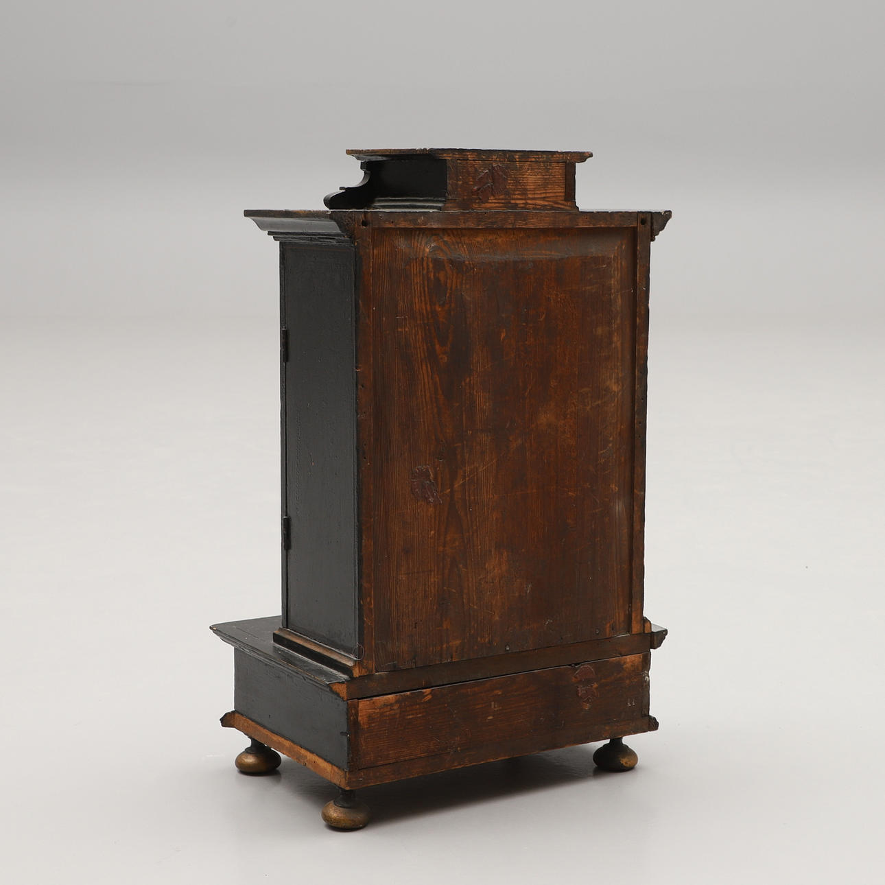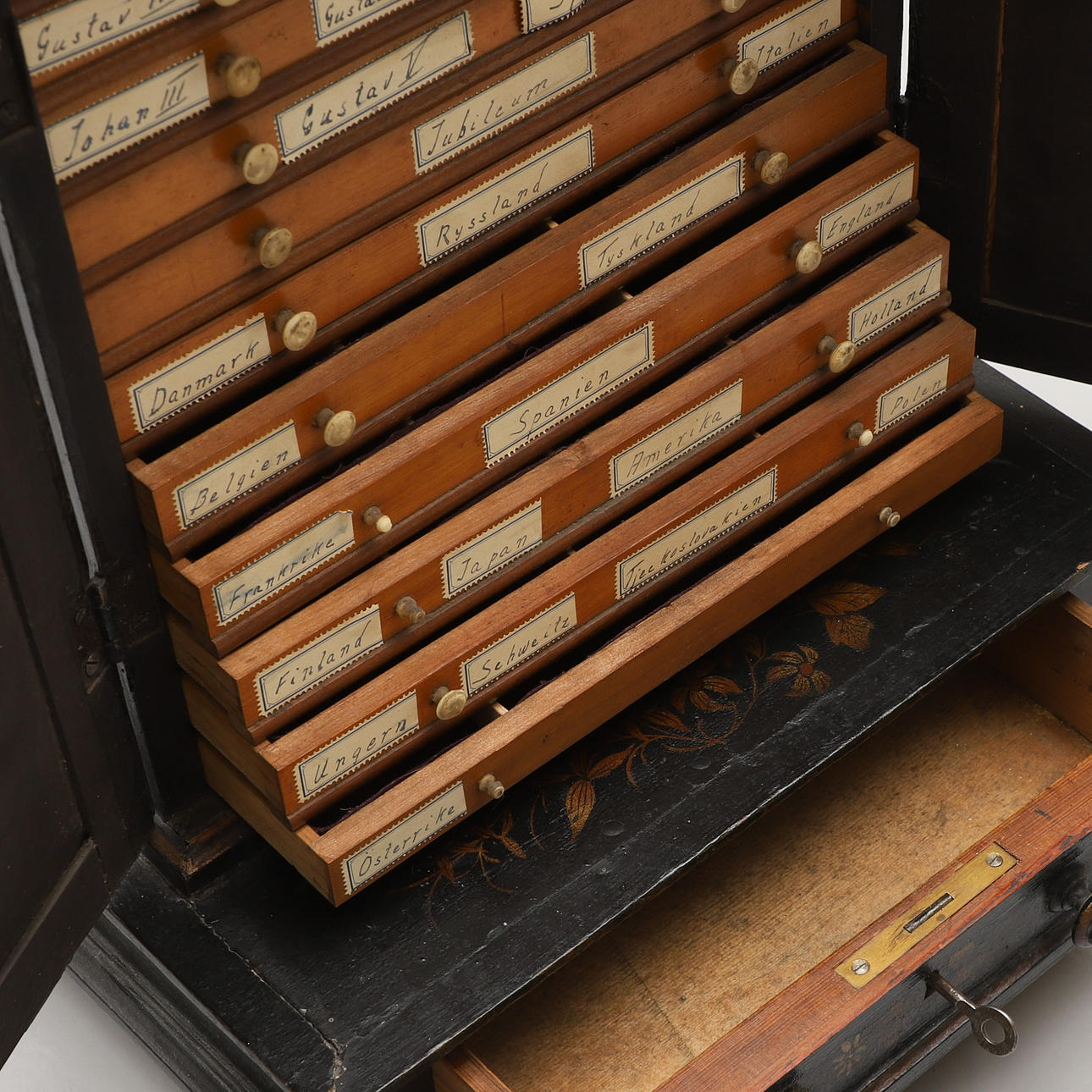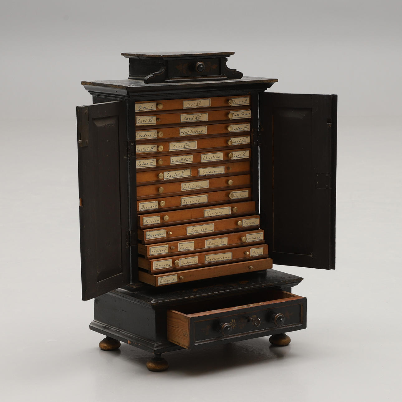 Maalattu viljasaksien, lehtien ja perhosten maalatulla koristeella. Sisustus laatikoilla. Leveys n. 33, syvyys 23, korkeus 53 cm.