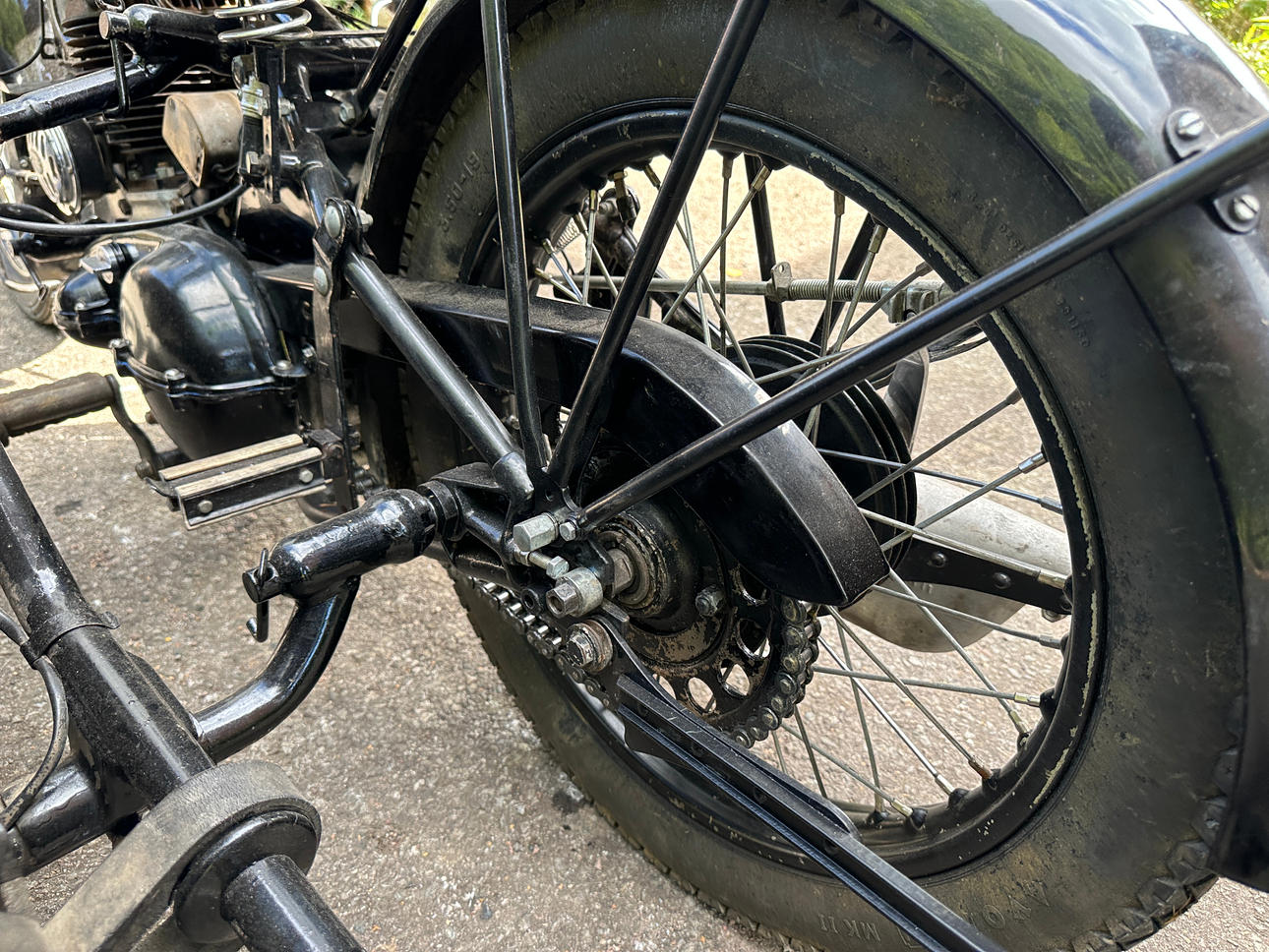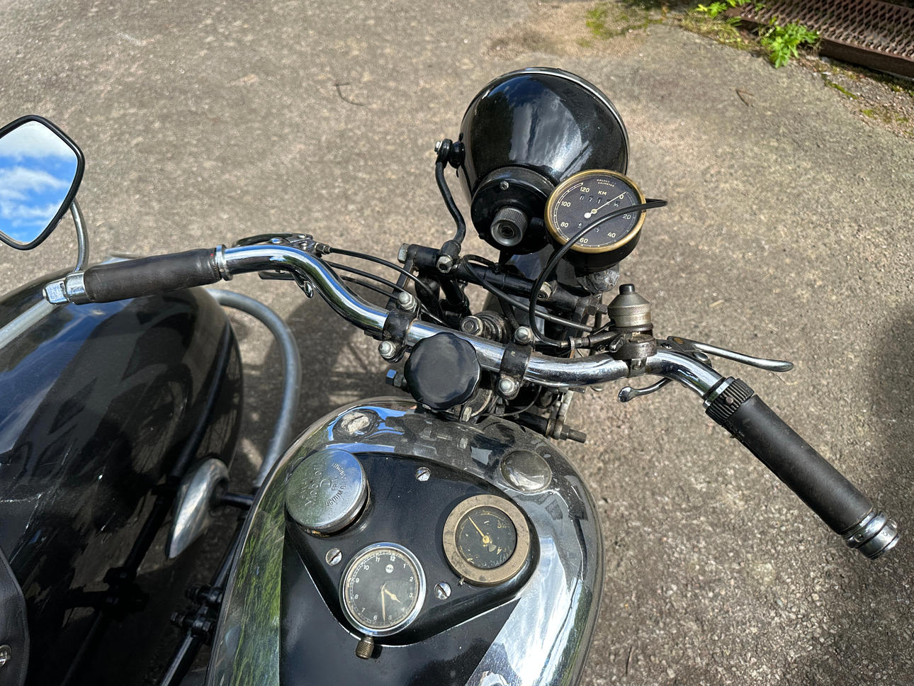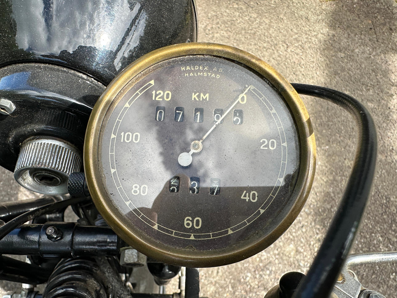Vuosimalli: 1933 Rekisteröintinumero: GFF535 Runkonumero: 11+683 Moottori: 1-sylinterinen, 500cc, SV Moottorinumero: 11X67434 Selkeä ruotsinkielinen nimike.