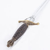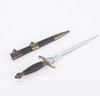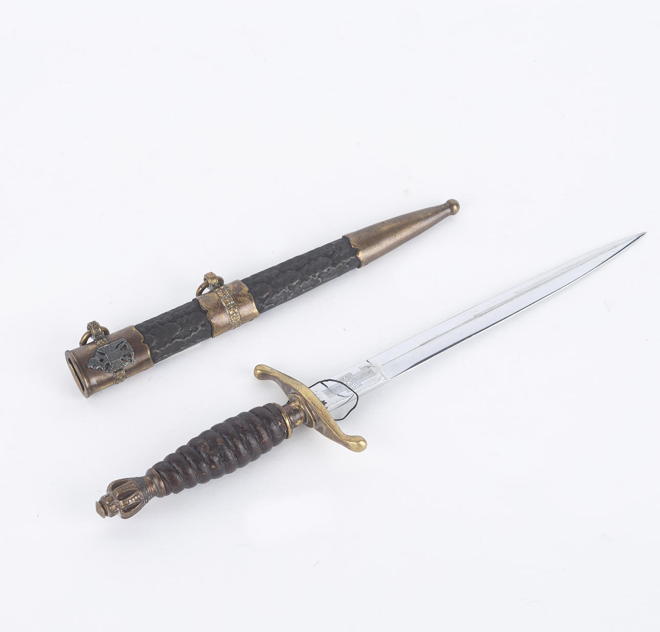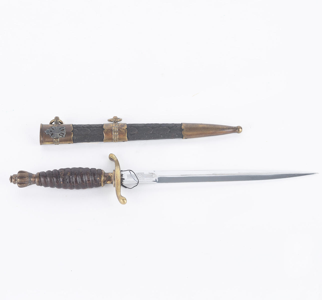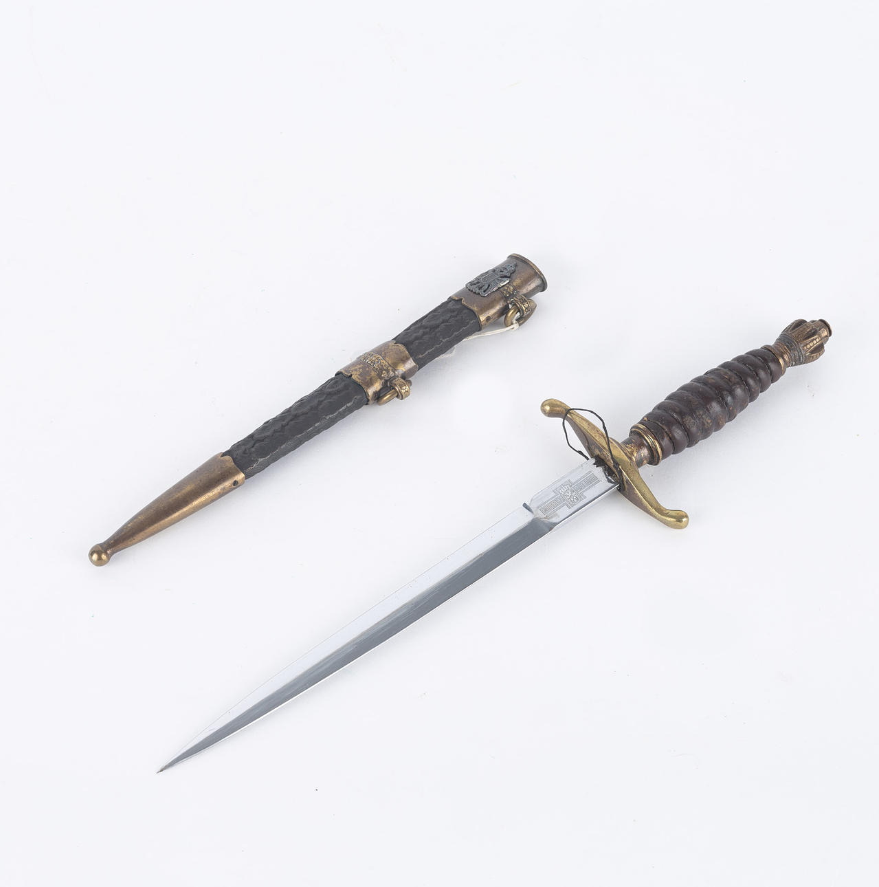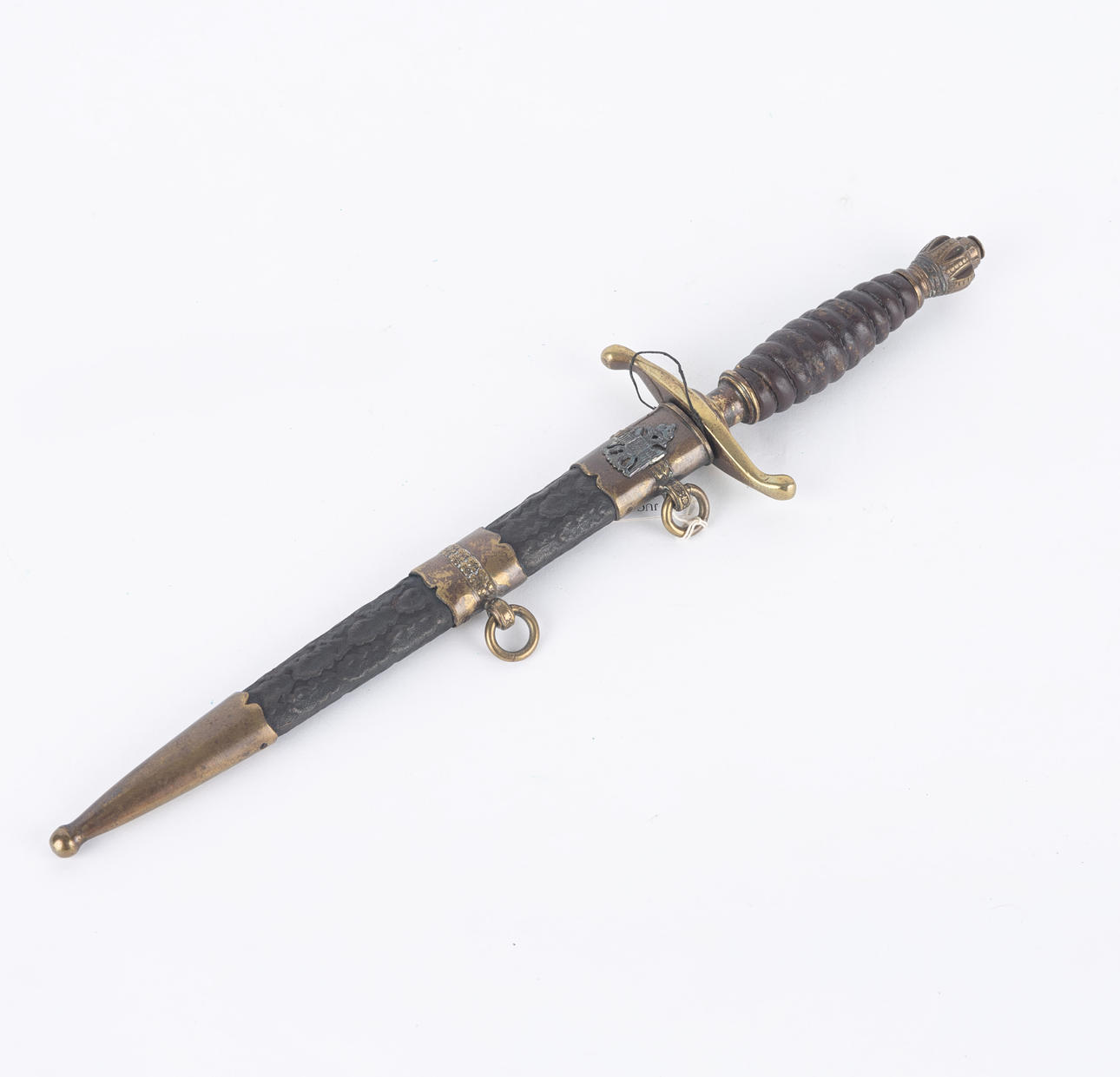 Messinkikiinnike nahkapäällysteisellä kaulimella, kaksoisreunalla varustettu terä ja etsattu Jugoslavian kuningaskunnan vaakunakoriste, pituus 23, kokonaispituus 36 cm. Nahkainen amme messinkiheloilla ja kahdella talutusrenkaalla.