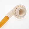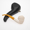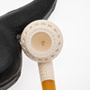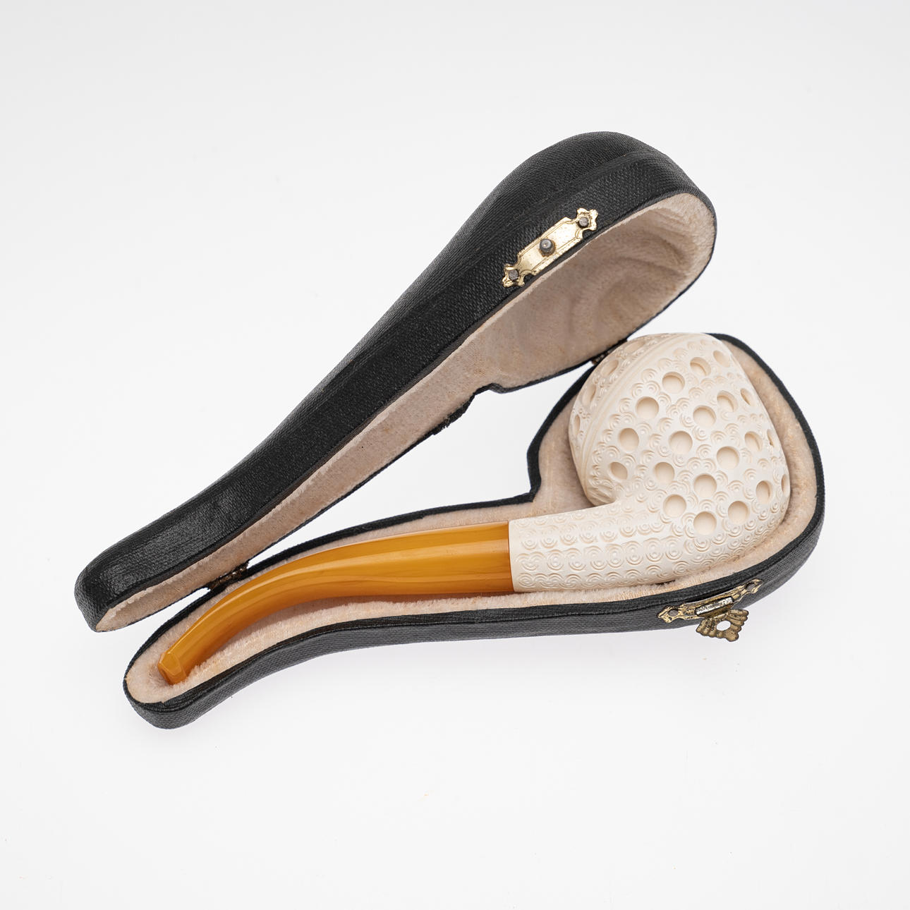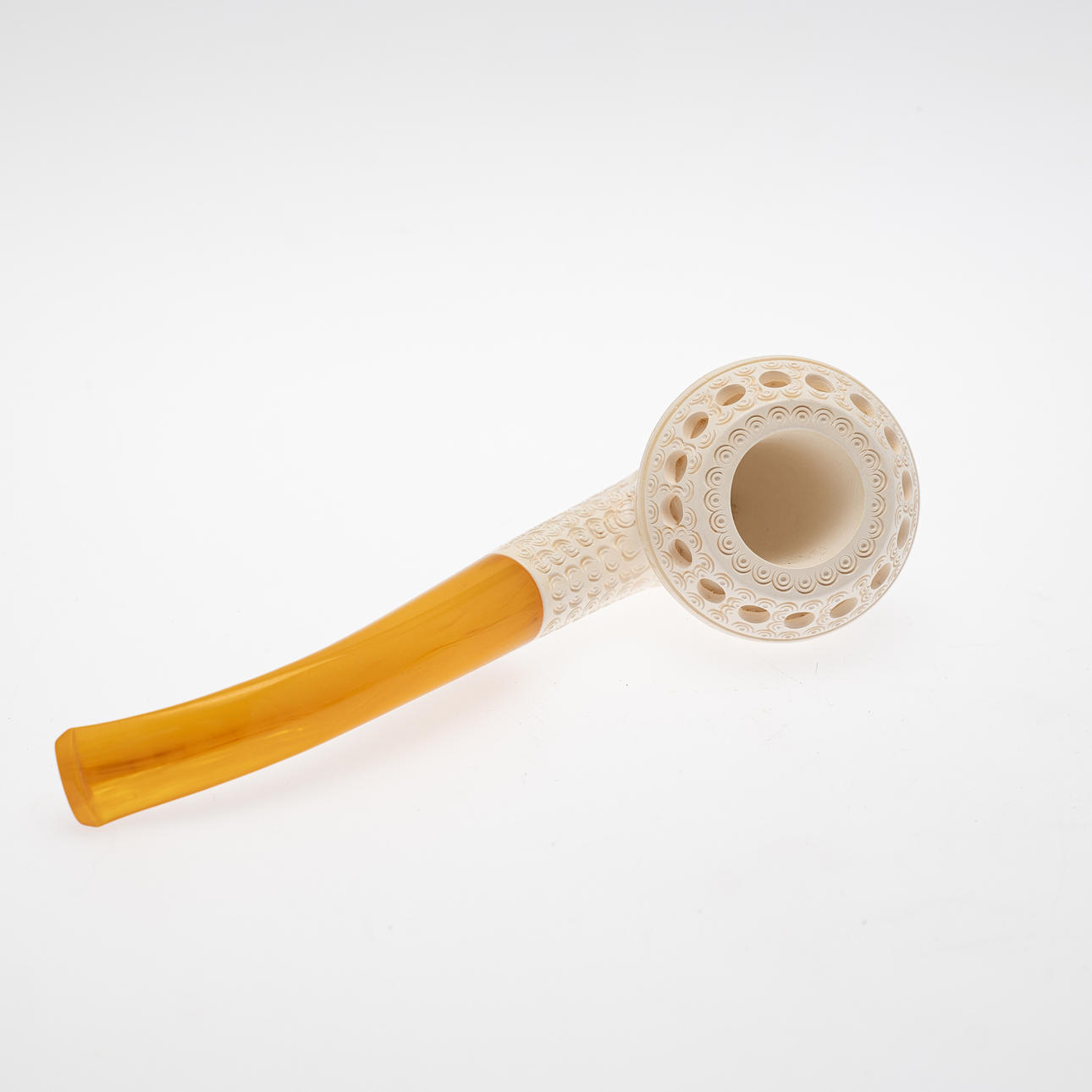 Putki, merenvaha, akryyli. Merenvahasta valmistettu putki, jossa koristekaiverrukset ja kaareva akryylisuukappale meripihkanvärisenä mustassa kotelossa, 9mm suodatinreiällä, L.17.5cm, L.8cm, K.6cm.