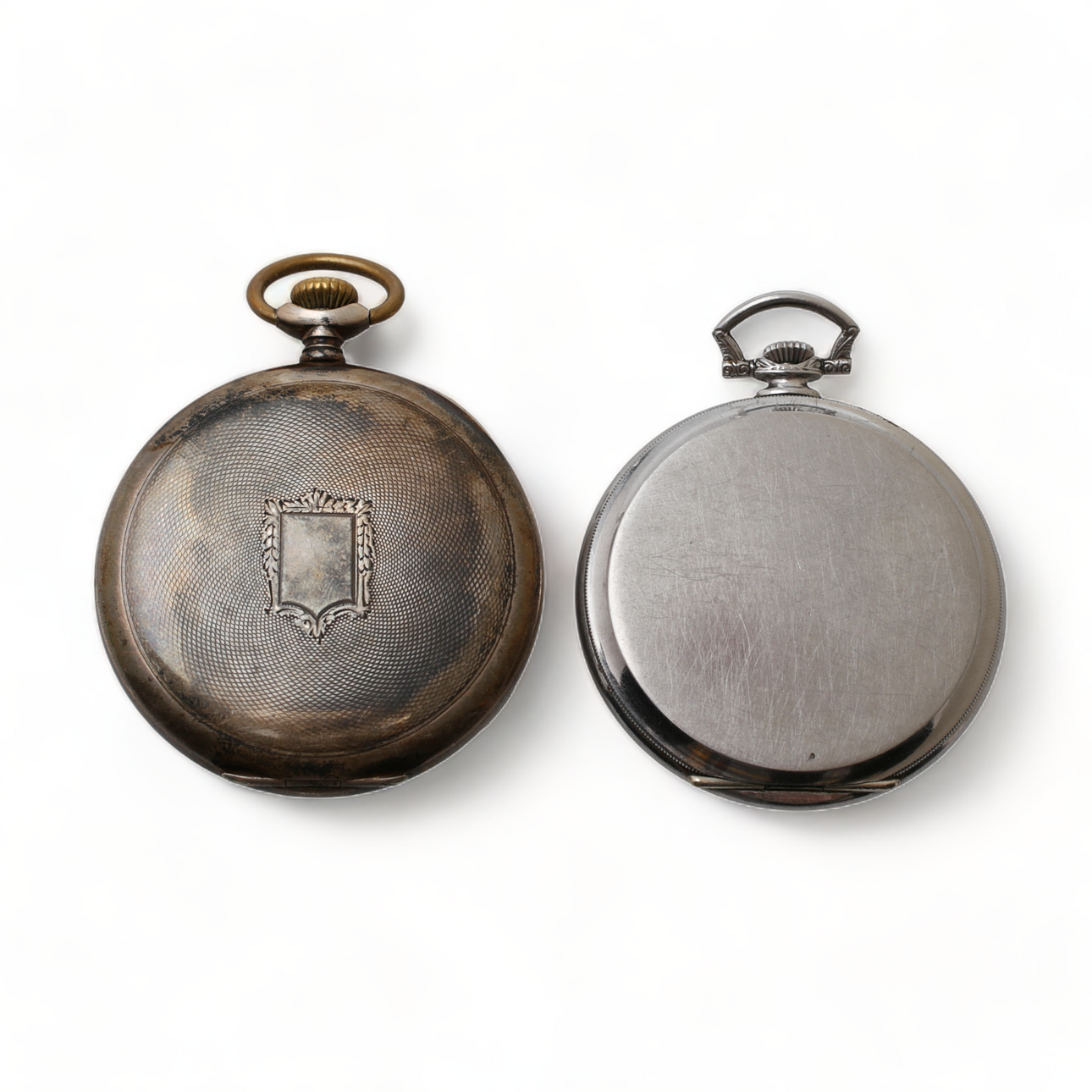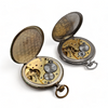 Molemmat työskentelivät luettelointihetkellä. Toimintatakuuta ei anneta, merkitsemätön taskukello lasissa halkeamia, kellotaulu likainen.