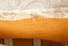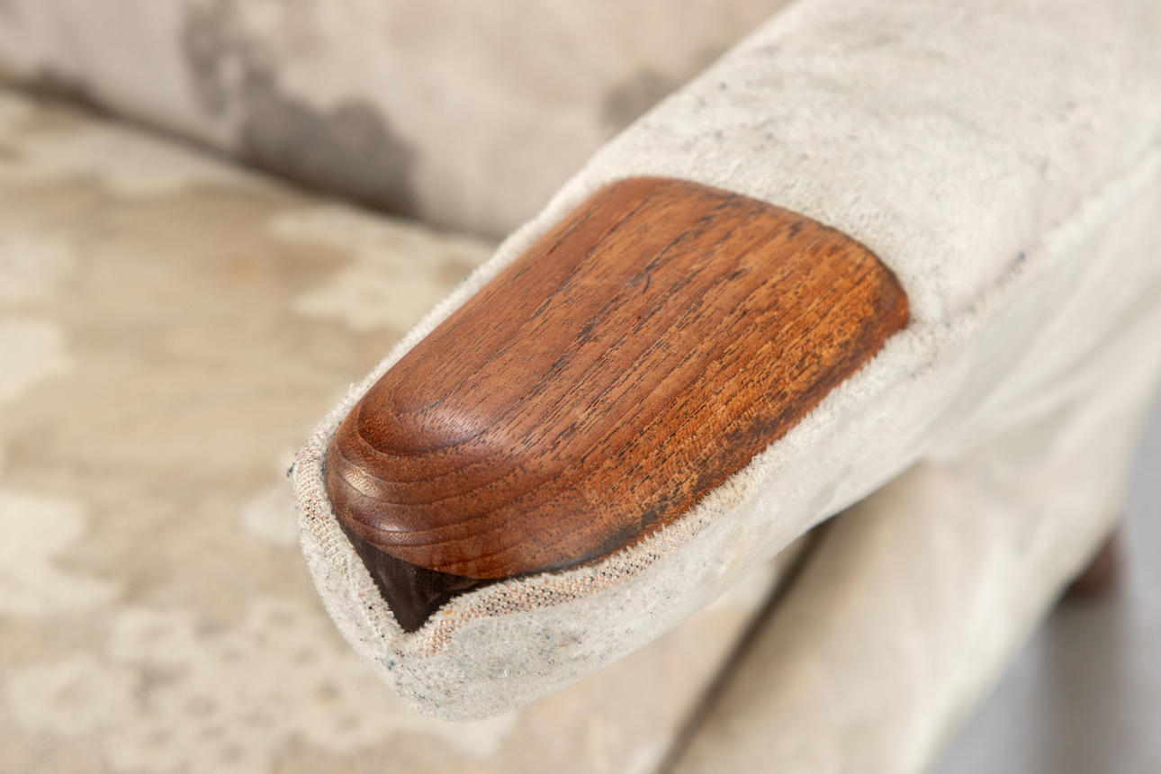 Tiikkipuuta, myöhemmin verhoiltu ja päällystetty vaalealla kukkakuvioisella kankaalla. Leimalla merkitty.