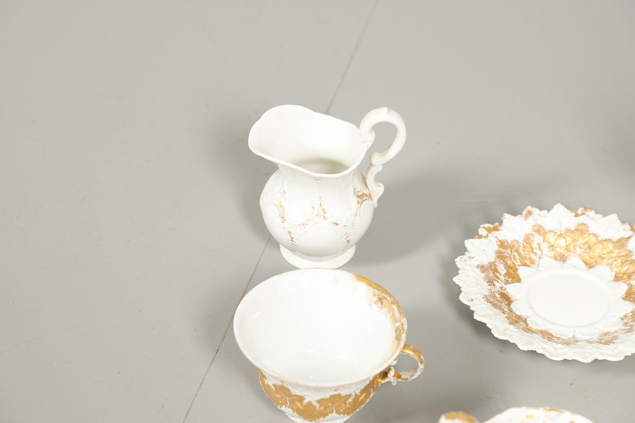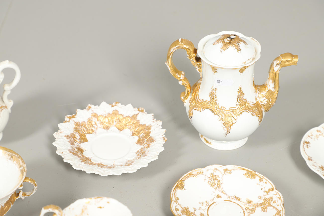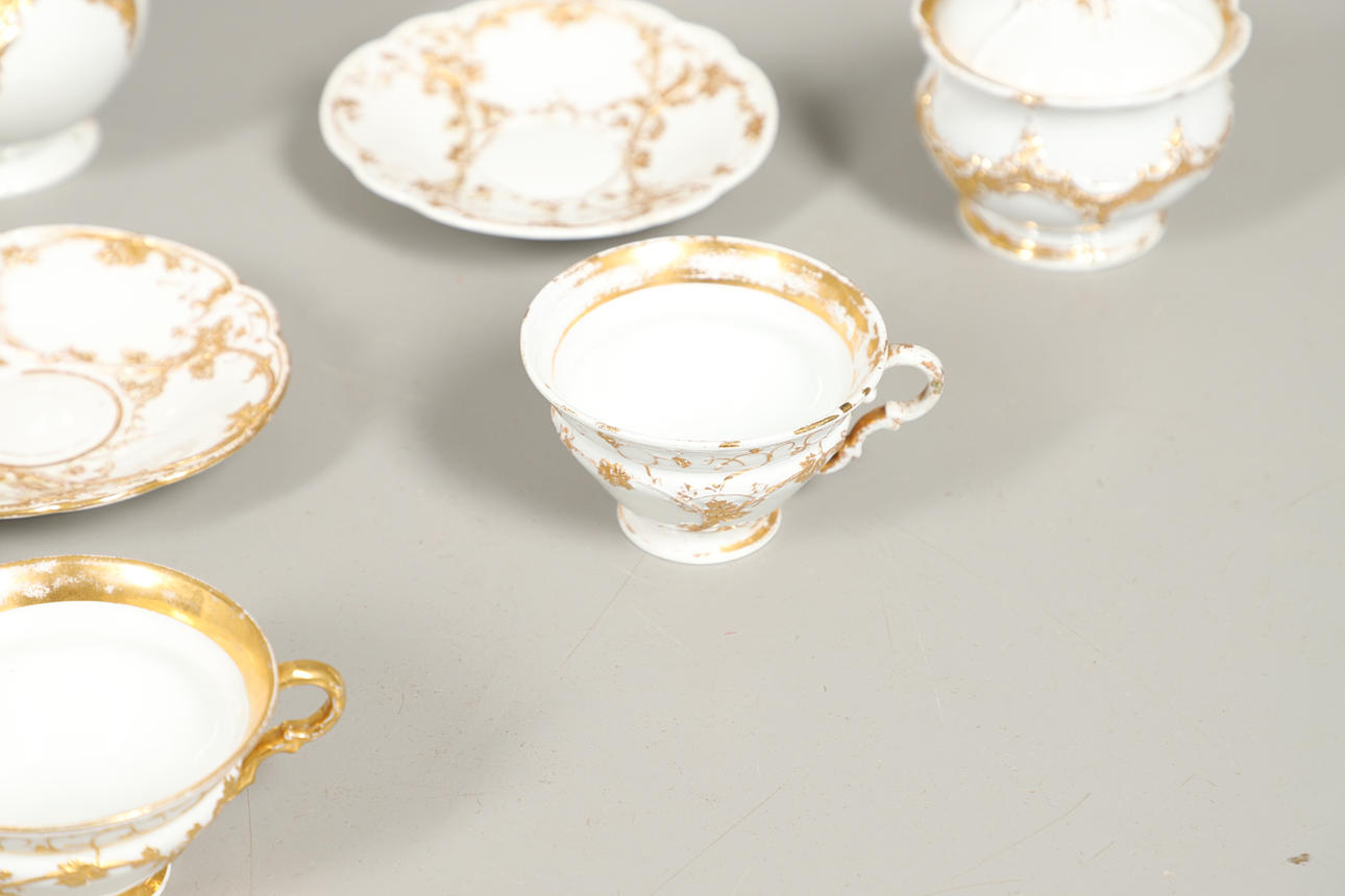 Sekaryhmä, jossa kullattu koristelu matalassa kohokuviossa, mukaan lukien kannellinen kahvipannu (lopullinen halkeama, 17 cm korkea), kannellinen sokerikulho, kupit ja lautaset jne. Erilaisia kulumia ja vaurioita.