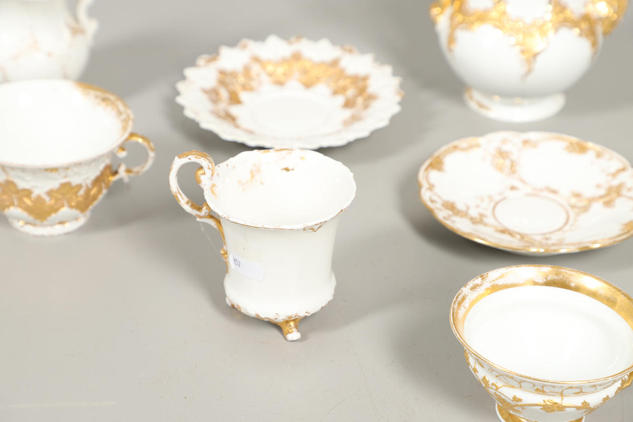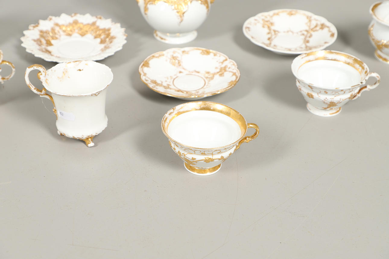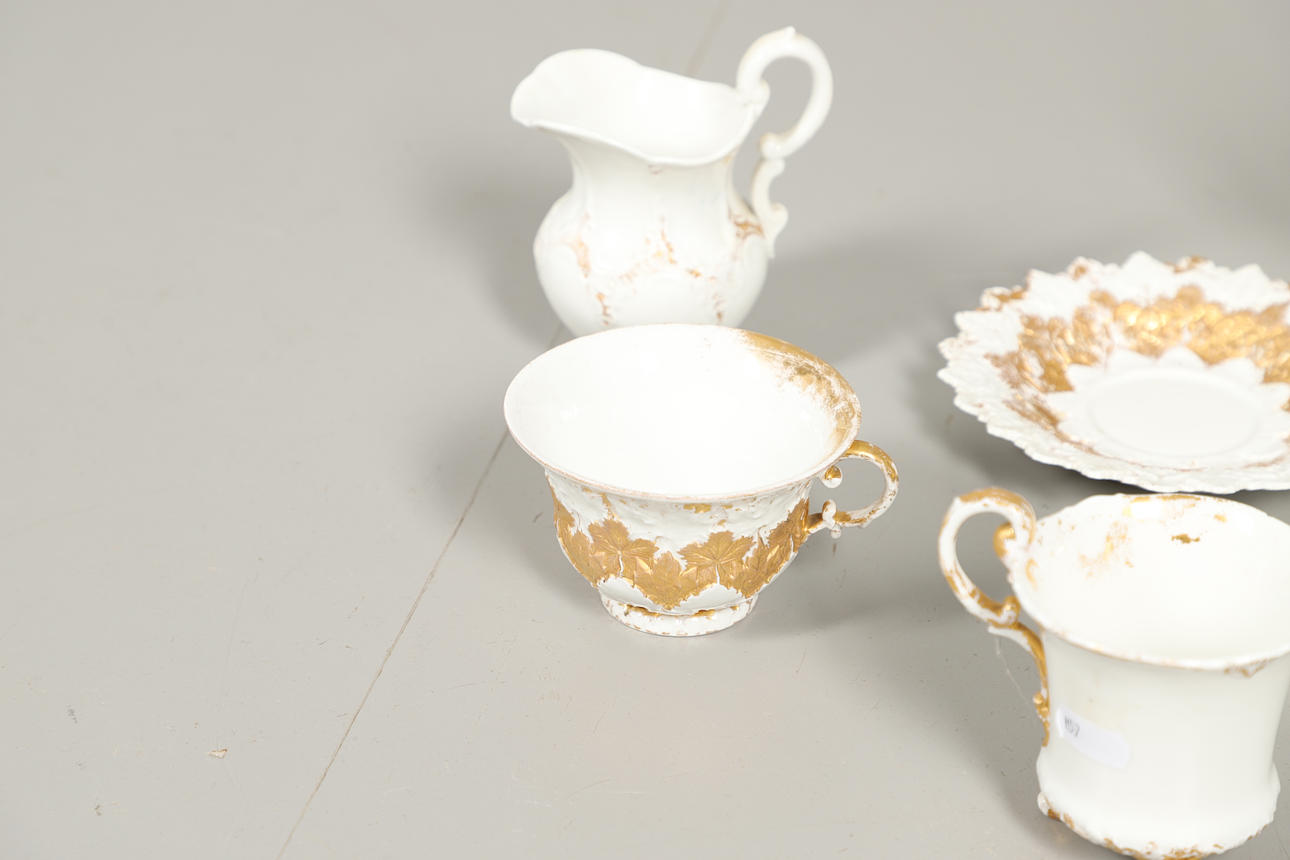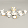Sekaryhmä, jossa kullattu koristelu matalassa kohokuviossa, mukaan lukien kannellinen kahvipannu (lopullinen halkeama, 17 cm korkea), kannellinen sokerikulho, kupit ja lautaset jne. Erilaisia kulumia ja vaurioita.