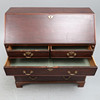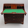kunnostettu, saranoitu pudotus, joka ympäröi tammea ja nauhoitettua sisätilaa, jossa on keskuskaappi, pienet laatikot ja kyyhkynen reiät, uusi vihreä baize upotettu kirjoituspinta, kaksi lyhyttä ja kolme pitkää laatikot alla, kannatinjaloissa, 107 cm leveä, 50 cm syvä, 110 cm korkea.