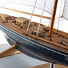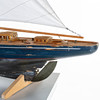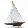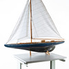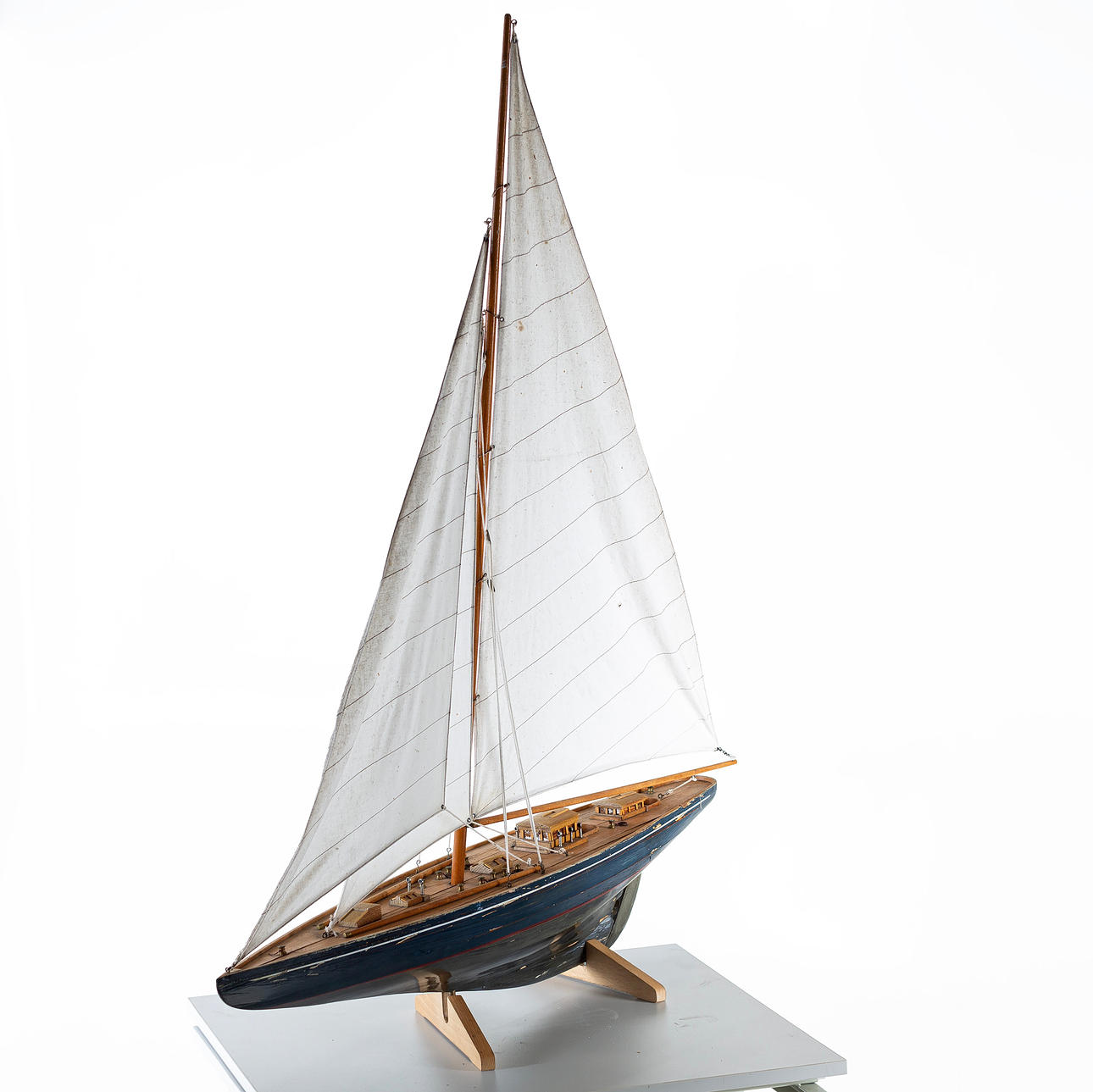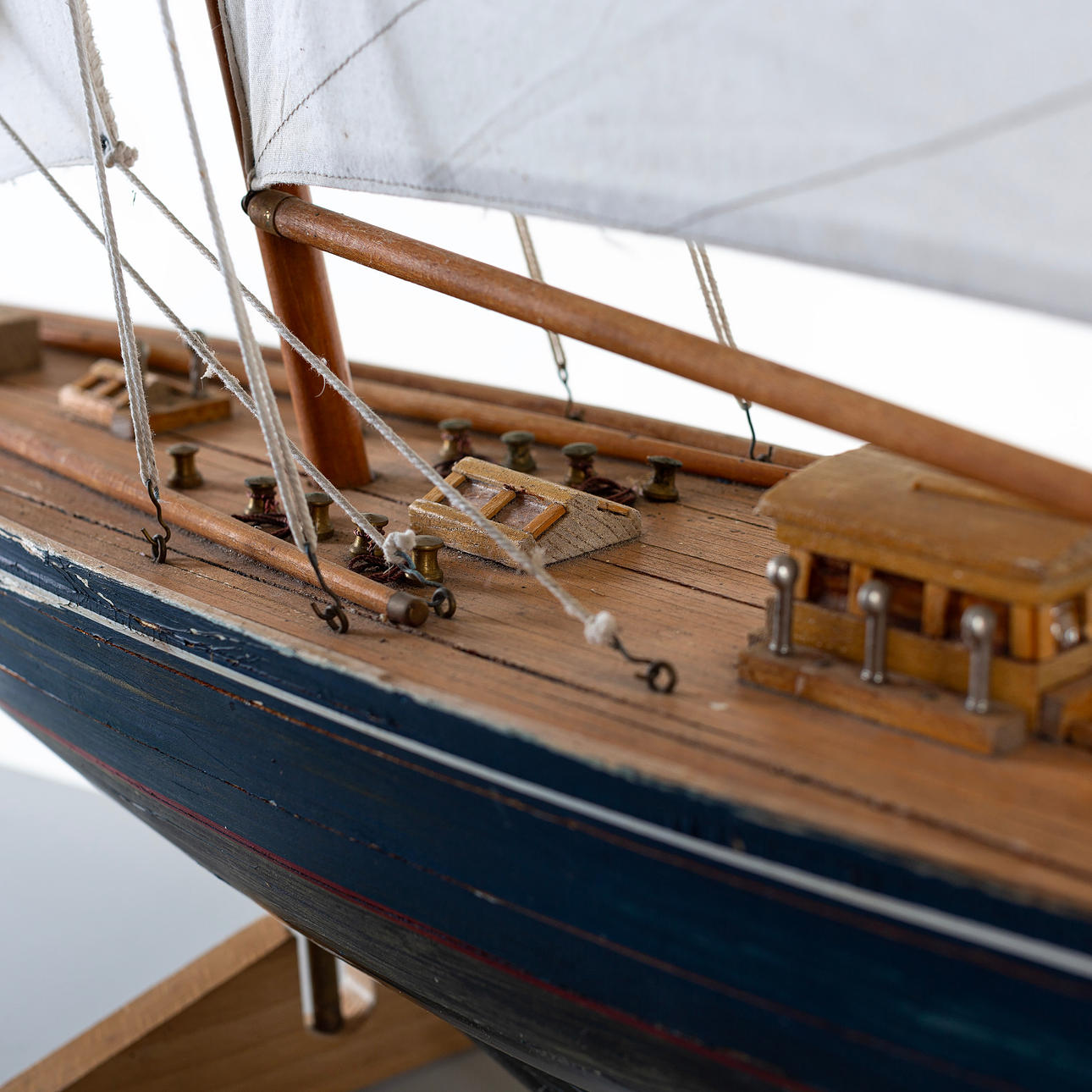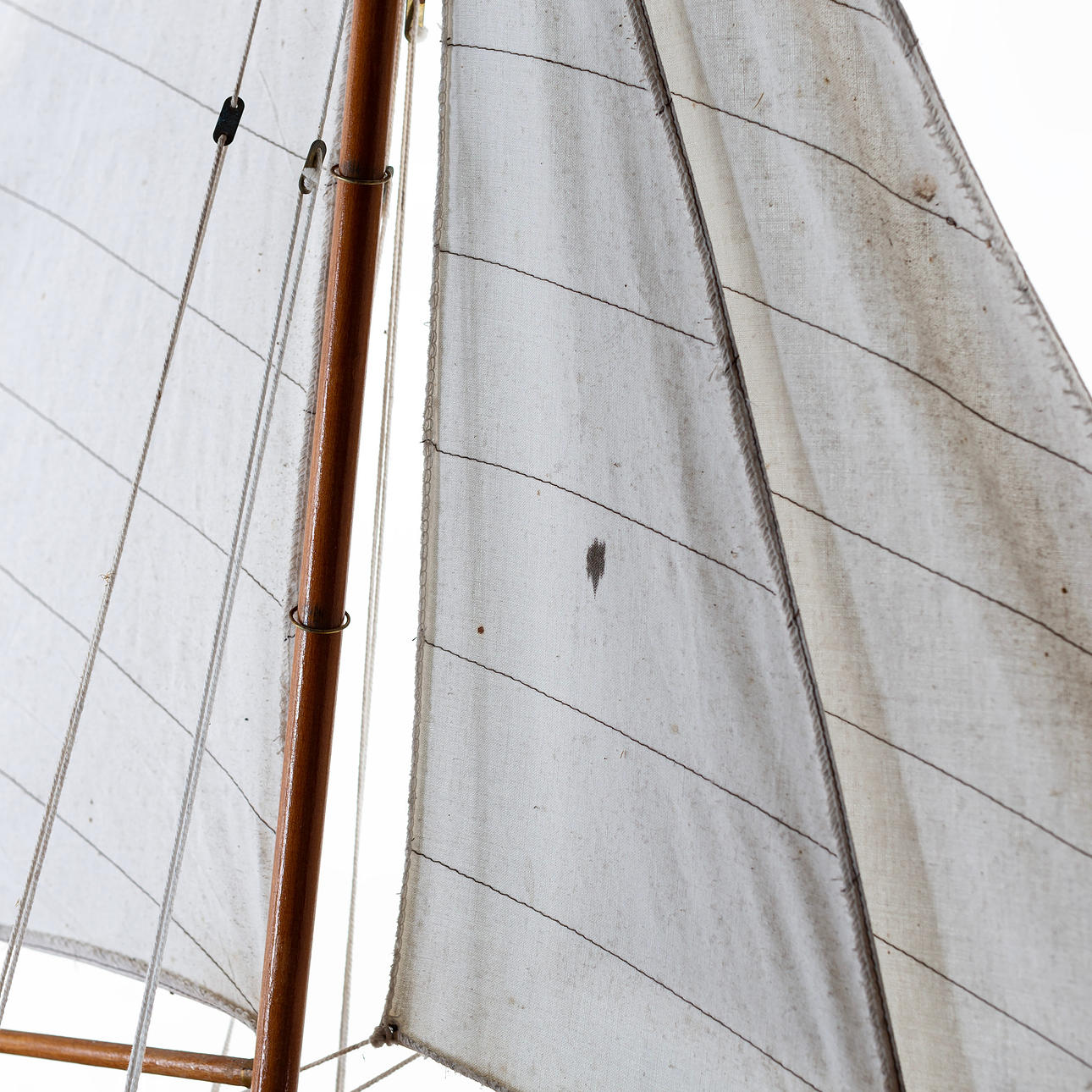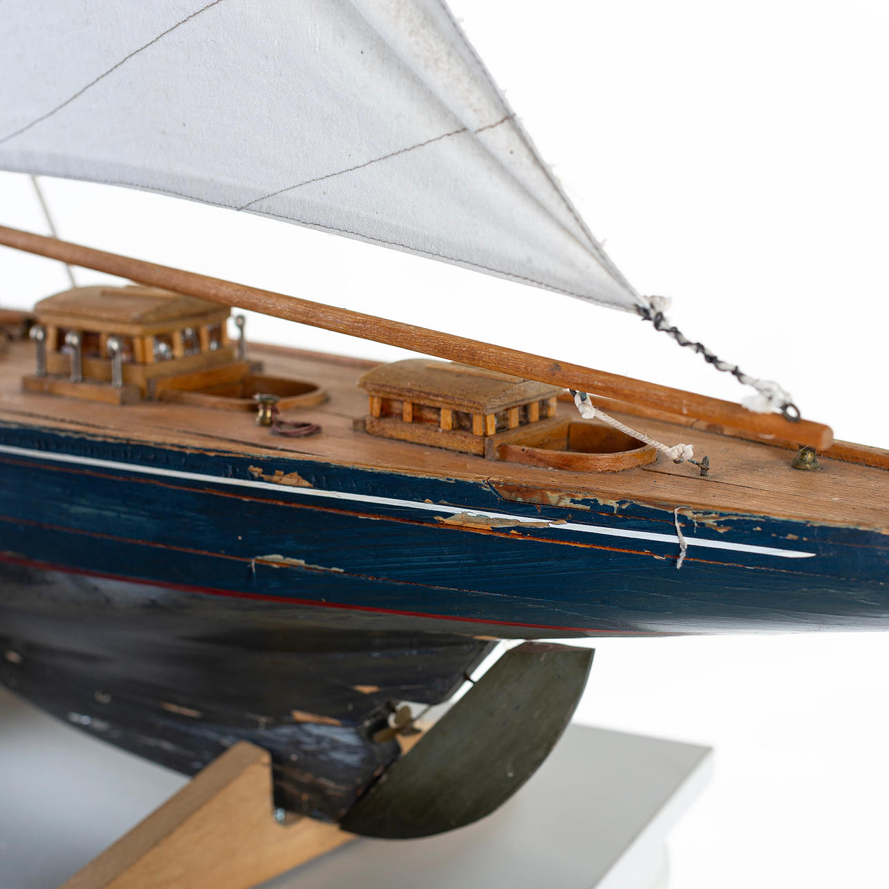 Purjeveneen kannessa kuivia halkeamia, pieniä tahroja purjeissa, maalinaarmuja ja kulumaa.