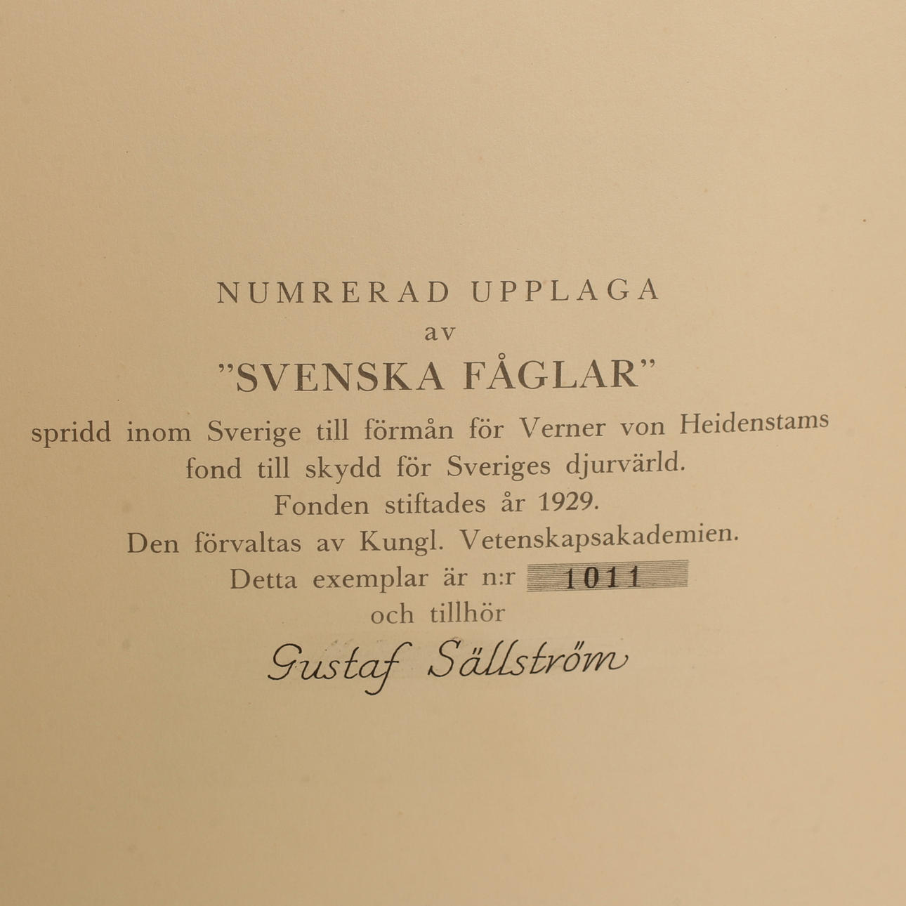 Koko ranskalainen nauha kultaisella tekstillä. Ensimmäinen bändi numero 1011, tekstillä "kuuluu Gustav Sällströmille".