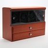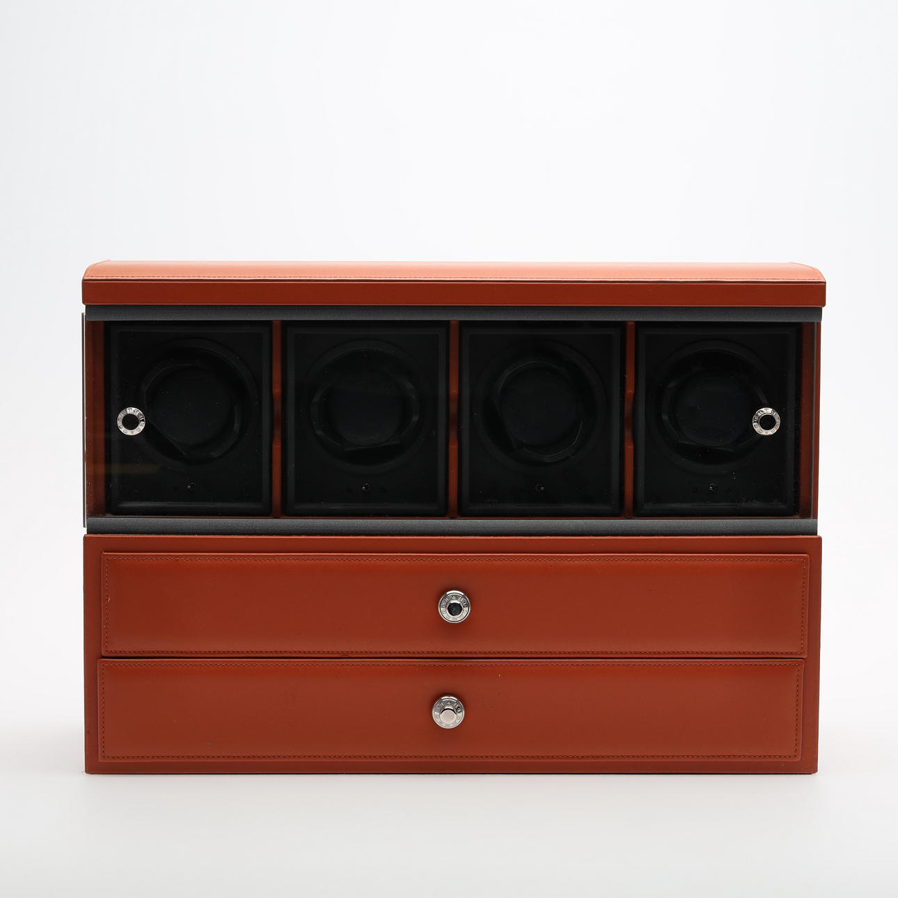 Nahkapäällysteinen. 4 vetolaitetta liukulasioven takana. Alareunassa kaksi laatikkoa, joista toisessa on tilaa 6 rannekellolle. Pituus 42, syvyys 16, korkeus 29 cm.